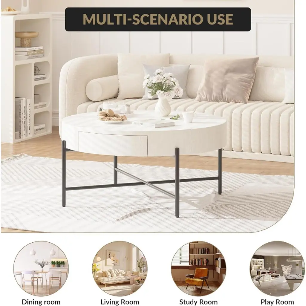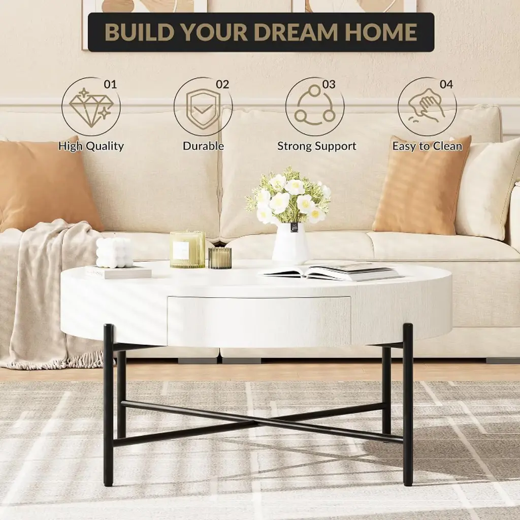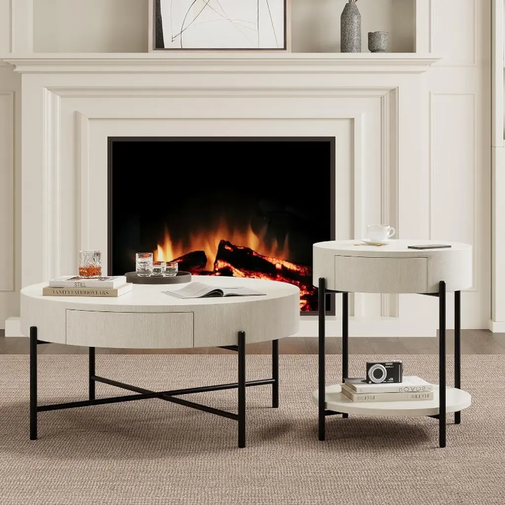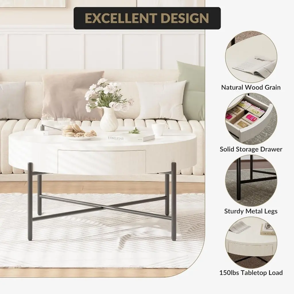 Add warmth and function to your space with this 31.9" round coffee table featuring a rich wood texture and smart storage solutions. Crafted from high-density MDF and supported by sturdy metal legs, this circle coffee table blends rustic charm with lasting durability. The wide tabletop offers a generous display surface for drinks, books, and décor, while two hidden drawers provide dust-proof, private storage for remotes, magazines, and more. Designed with a vintage-inspired look, it seamlessly fits into farmhouse, boho, or modern living rooms. Each leg comes equipped with non-slip foot pads for added stability and floor protection. Whether used for entertaining, reading, or relaxing, this center table adds style and practicality to your home.Specifications:Brand: NasitipColor: Brown / WhiteMaterial: MDF Wood, MetalFrame Material: WoodTop Material Type: WoodProduct Dimensions: 31.9"D x 31.9"W x 15.75"HItem Weight: 32.5 lbsBase Type: LegShape: RoundRecommended Uses For Product: Reading, Meeting, Storing, Writing, DisplayingAssembly Required: Yes