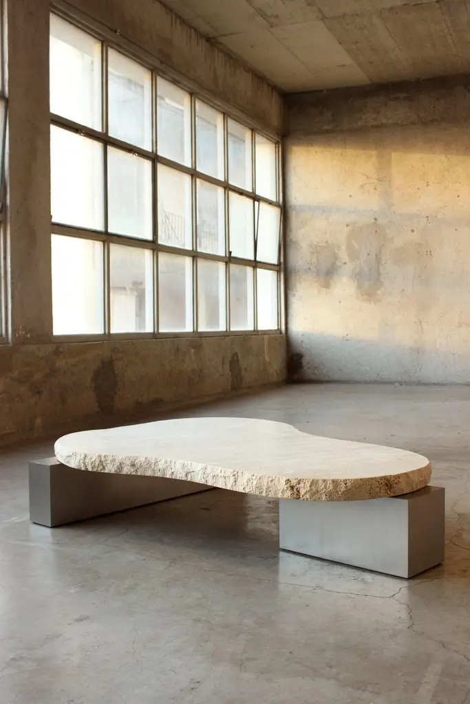 New! Dooq! Modern! On The Rocks Center Table In Travertine, Metal And Wood
