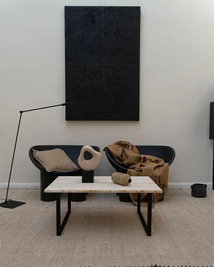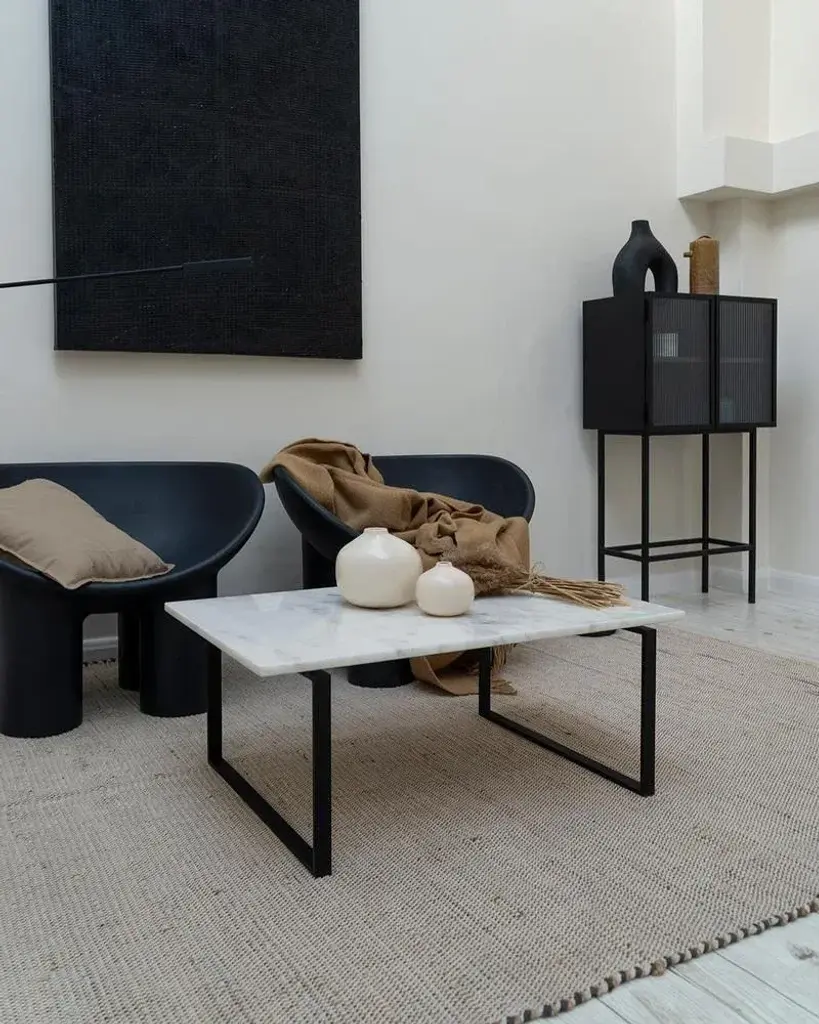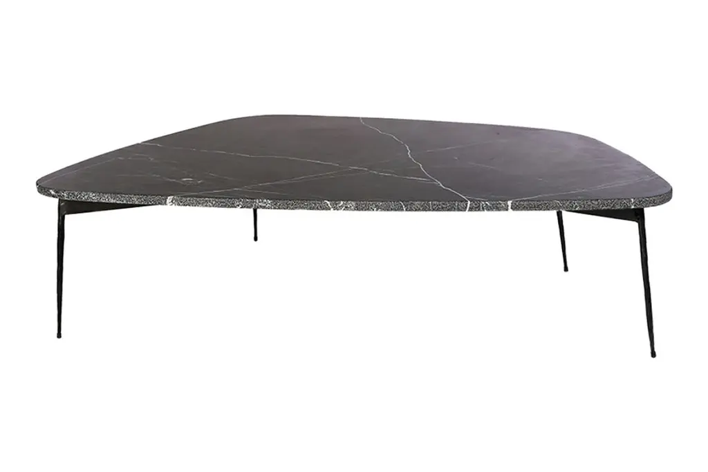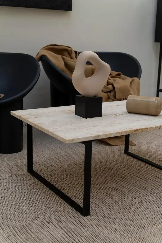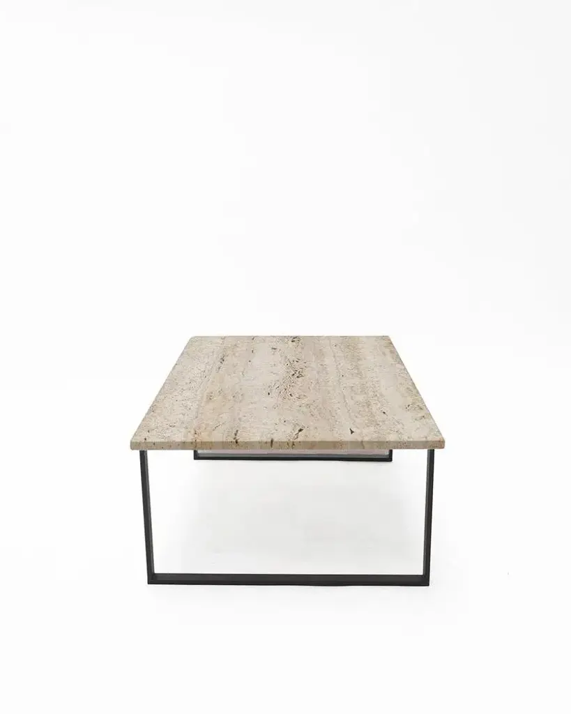Object 043 center table by NG Design Dimensions: D90 x W60 x H37cm Materials: Powder coated steel, Travertine/Marble Bianco Ibiza/ Marble Nero marquina. Also Available: All of objects available in different materials and colors on demand. Object043 is a simple design with an interesting detail that gives the impression that the tabletop is hovering over the frame.