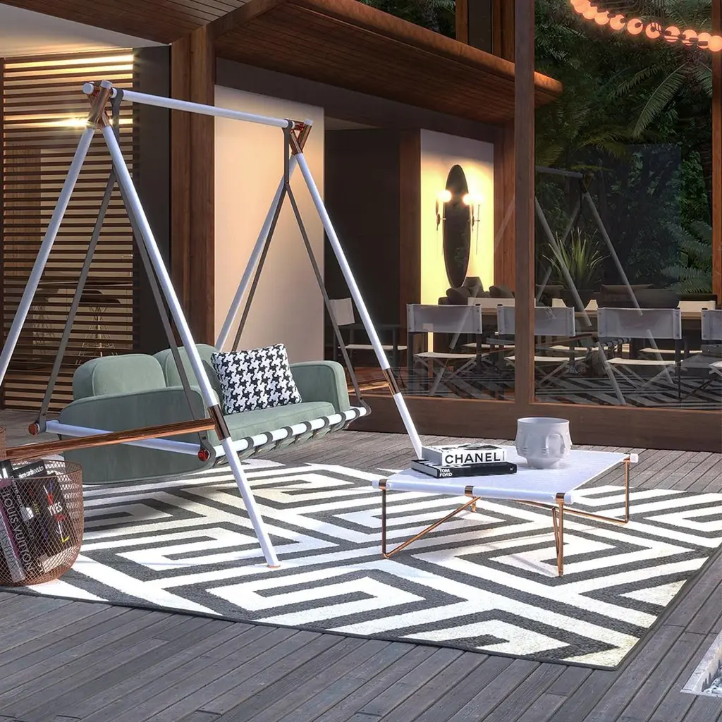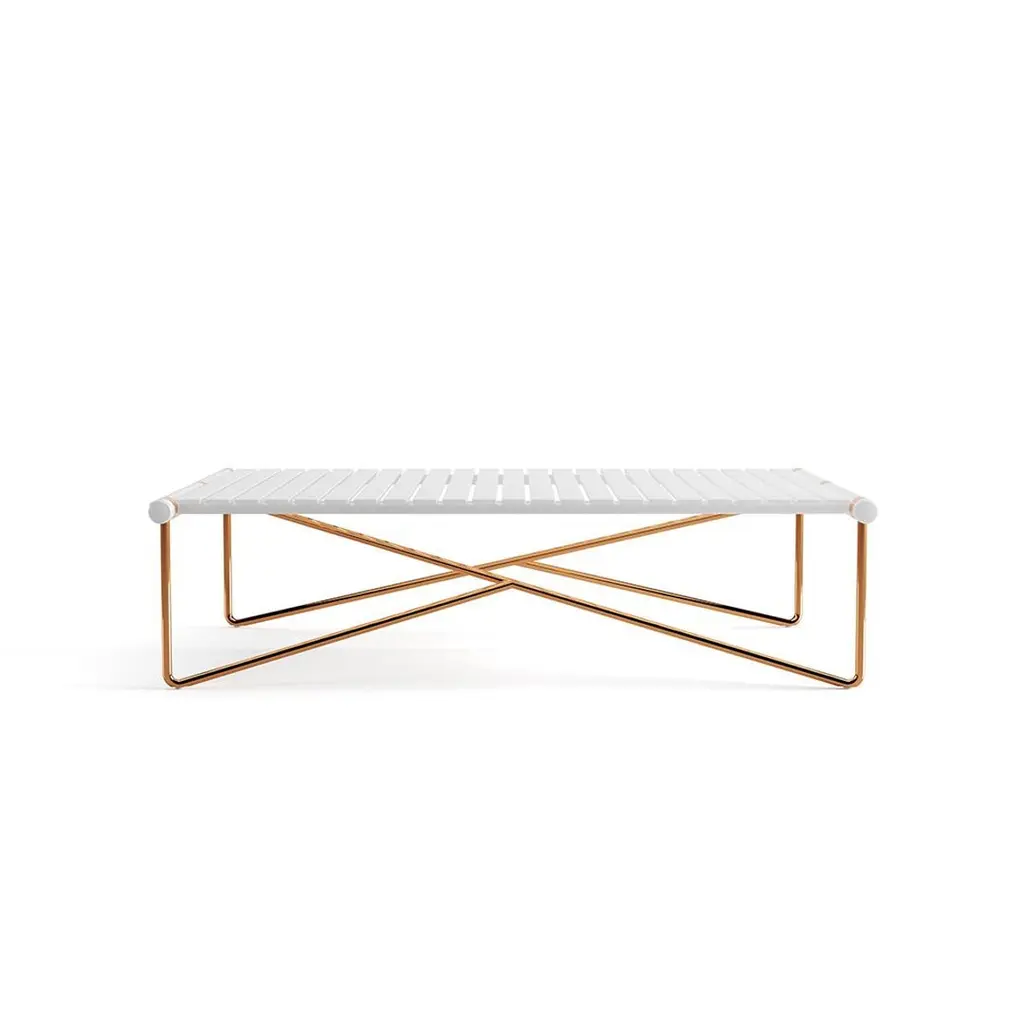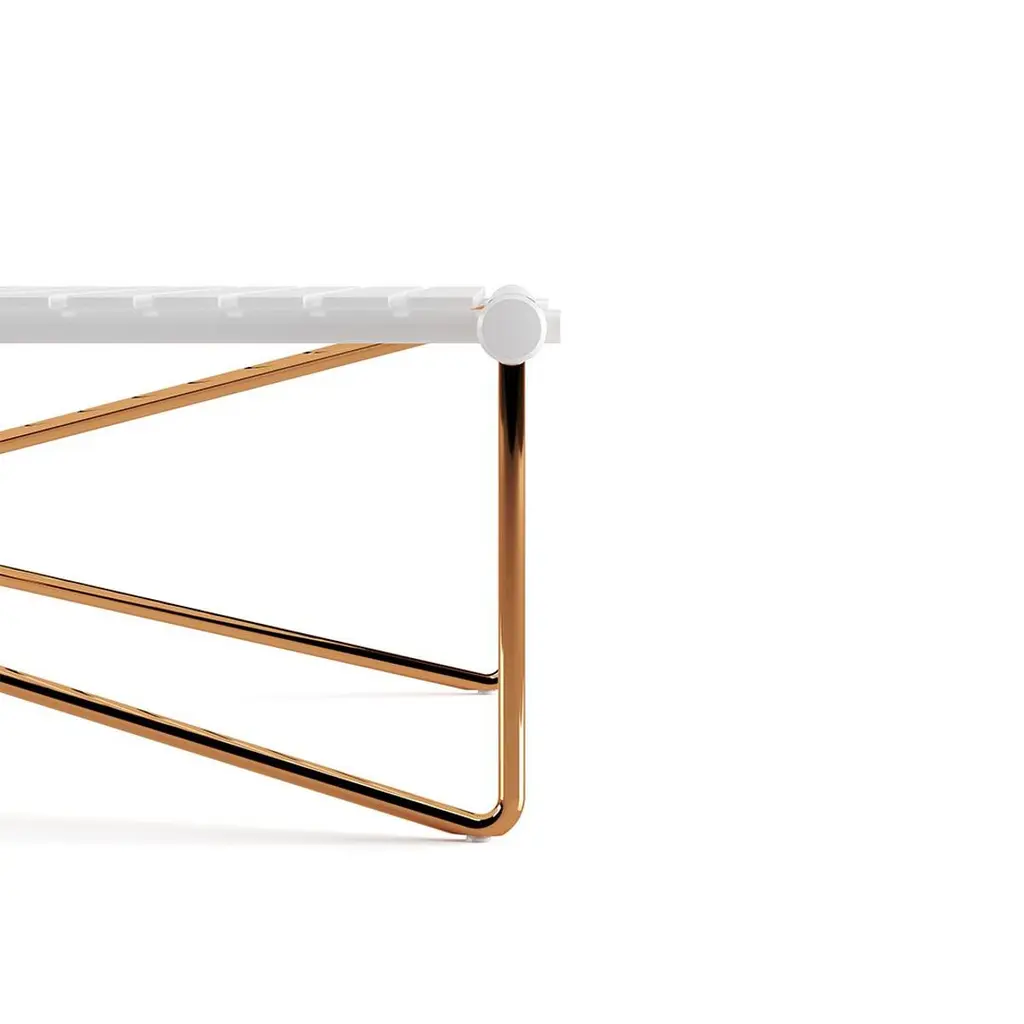 The whole design of this sophisticated outdoor center table was developed according to the following structure: -Top: White matte lacquered aluminum and stainless steel;-Legs: Gold plated stainless steel;-Details: Gold-plated stainless steel.All Myface materials are from premium suppliers, engineered to offer the best performance possible outdoors.Water, Mold, Mildew, UV, and Fading resistance are some of the characteristics that you can expect from both materials, which are available in a wide array of colors and patterns.Noa, contemporary outdoor center table smallSome of the customization options for your Noa center table small: Chocolate Brown, Gold lacquer, Myface Blue, Copper Brushed, Black Nickel, Gold Plated, and Gold Brushed.The Noa center table small is a harmonious combination between functionality and a sophisticated design. The elegant copper legs are the support for the beautiful white lacquer aluminum top, resulting in a very functional yet elegant outdoor set.