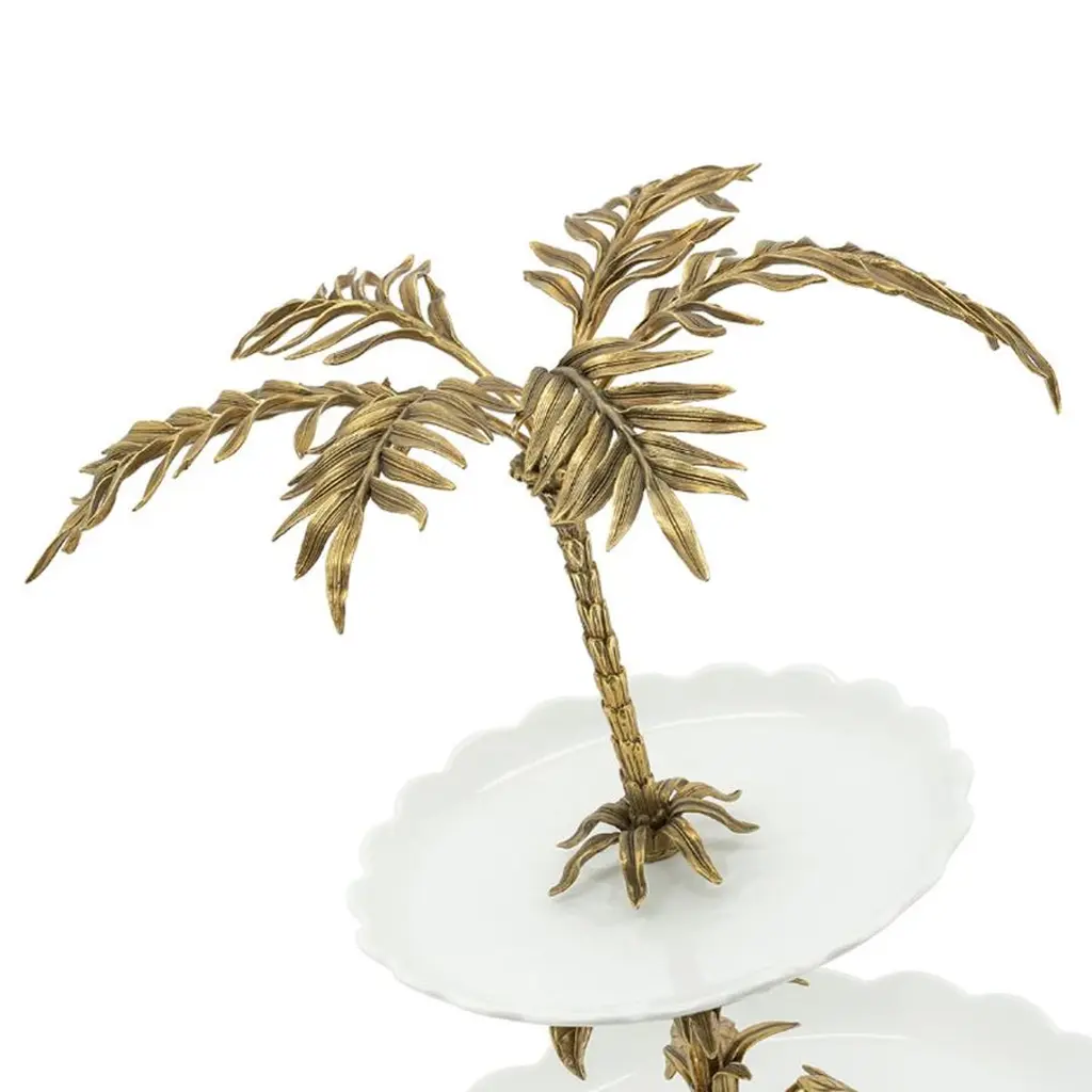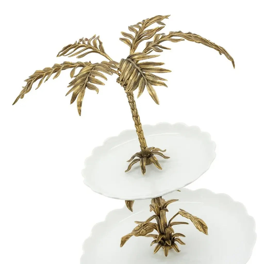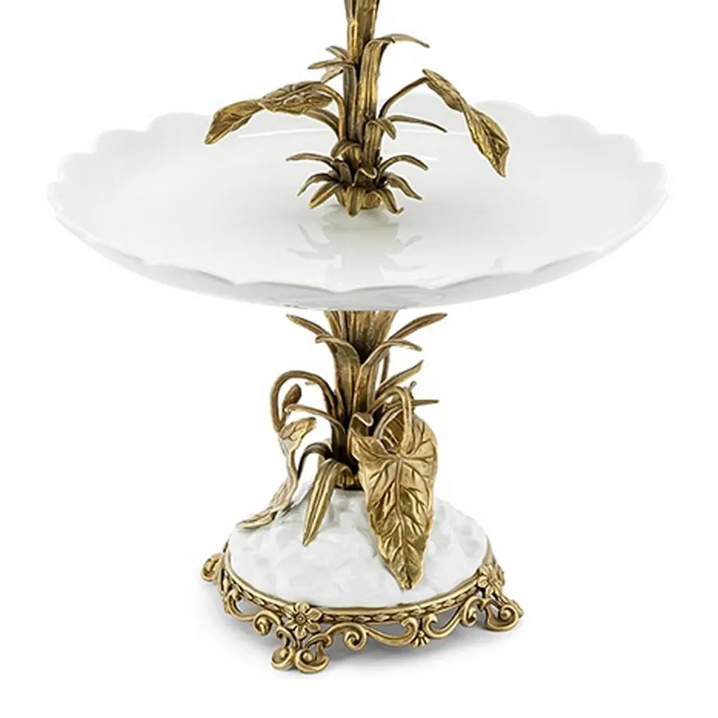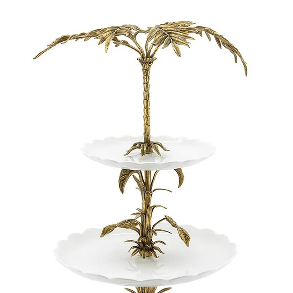 Serving piece palms center table with2 plates and base in enameled porcelain.With solid bronze structure and details invintage finish. Elegant piece.