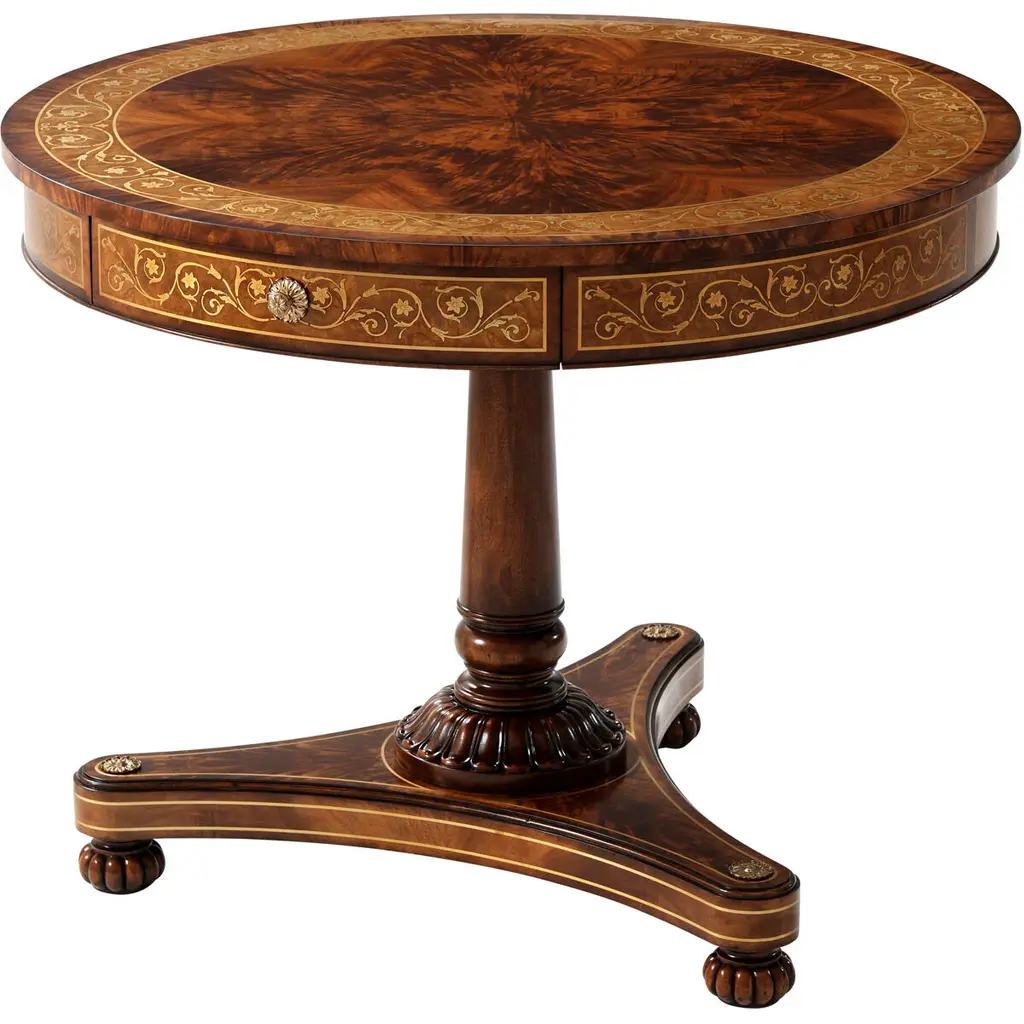 A Regency style mahogany veneer and solid brass inlaid drum top center table, the circular top inlaid with a band of scrolling leaves, the frieze fitted with a center drawer, on a turned and tapering column with lapette carved base, on a concave sided brass strung plinth with rosette corners, on lobed bun feet. The original Regency.Dimensions: 38“ W x 38“ D x 30“ H.