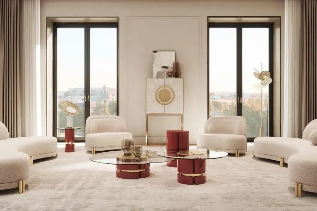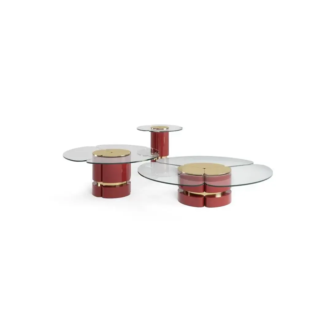 Euphoria Small Center Table by Memoir Essence Dimensions: D 50 x W 50 x H 50 cm. Materials: Polished brass, lacquer and glass. Available in different sizes. Memoir presents the new center table set Euphoria. Dynamic, and classy, this is a new version for Euphoria Collection. In a rich and deep red lacquered base, with polished brass details this piece is finished in high gloss varnish. The top of the tables is in transparent glass. An extraordinary set that can be used combined or separated to enhance any interior.