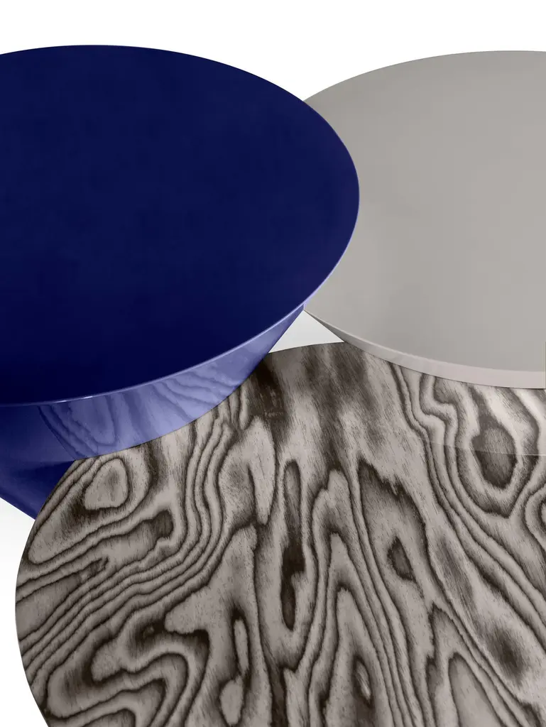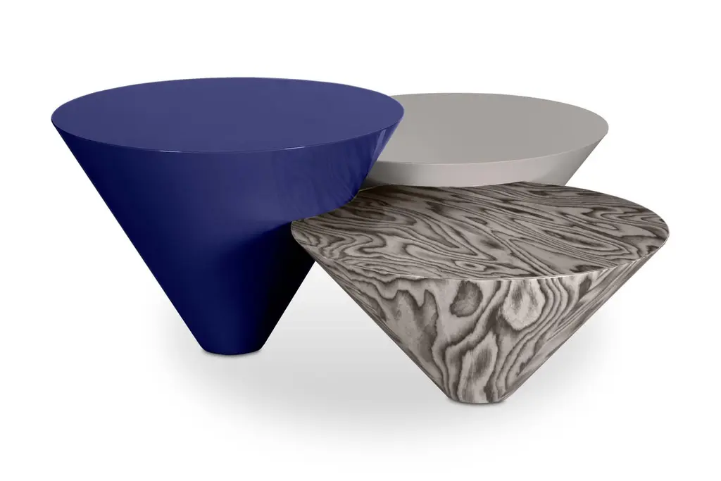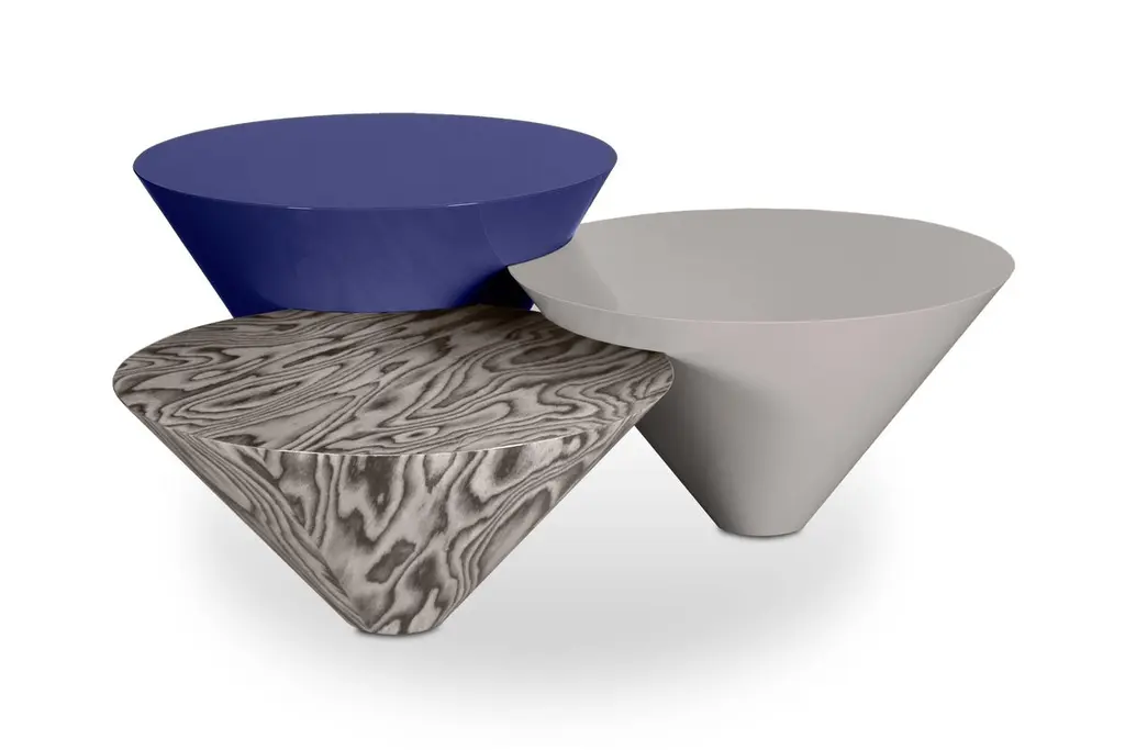 Sorbet center table by Royal StrangerDimensions: Width 121cm, height 46cm, depth 109cmMaterials: Upper lacquered in cherry red with glossy finish.Middle lacquered in pesca with glossy finish.Lower in Sottsass red wood veneer with glossy finish.Weight: 63.5 kgAlso available in other colors.Like a nomadic waltz, Sorbet Center Table describes a rhythmical combination of geometrical volumes showcasing distinct heights. All is crystallized into alluring conical shapes, revolving around three edges.The forceful tercet may be emphasized by different colors and lacquers, alongside with hypnotic wood patterns.This otherworldly design will gravitate towards your room and intersect your leisure moments with a fresh accent.Royal Stranger is an exclusive furniture brand determined to bring you the best unique pieces of art and design.Fusing design, art and the best craftsmanship, they strive to deliver the best state of the handmade art furniture. The design team works every day to create meaningful products that represent values such as passion, function, aesthetics and know-how. Values that are meant to represent Royal Stranger’s DNA. This dedication is present at all stages of production and the combination of craftsmanship and innovative design contributes toour final purpose: to produce certified high-quality products, made with passion and expertise and using royal materials such as gold leaf, rich woods and high quality lacquers.It was in 2013, as an architects, that Sofia Santos & Rui Santos started to push the boundaries of innovation in several retail design concepts for some of the best stores in Portugal. This will has always been present in their work, and that’s how the brand was born.