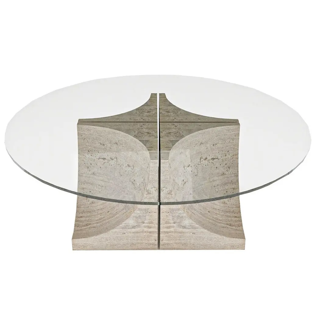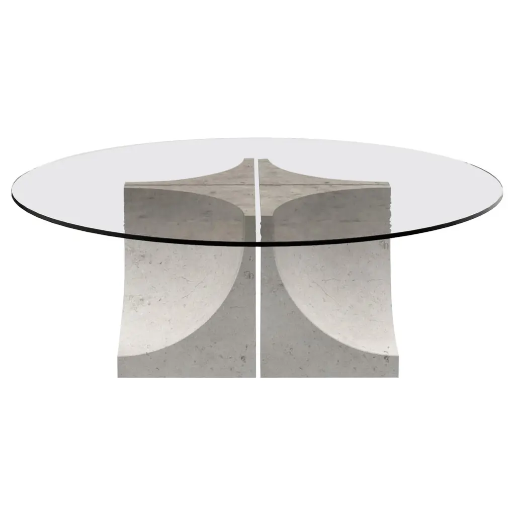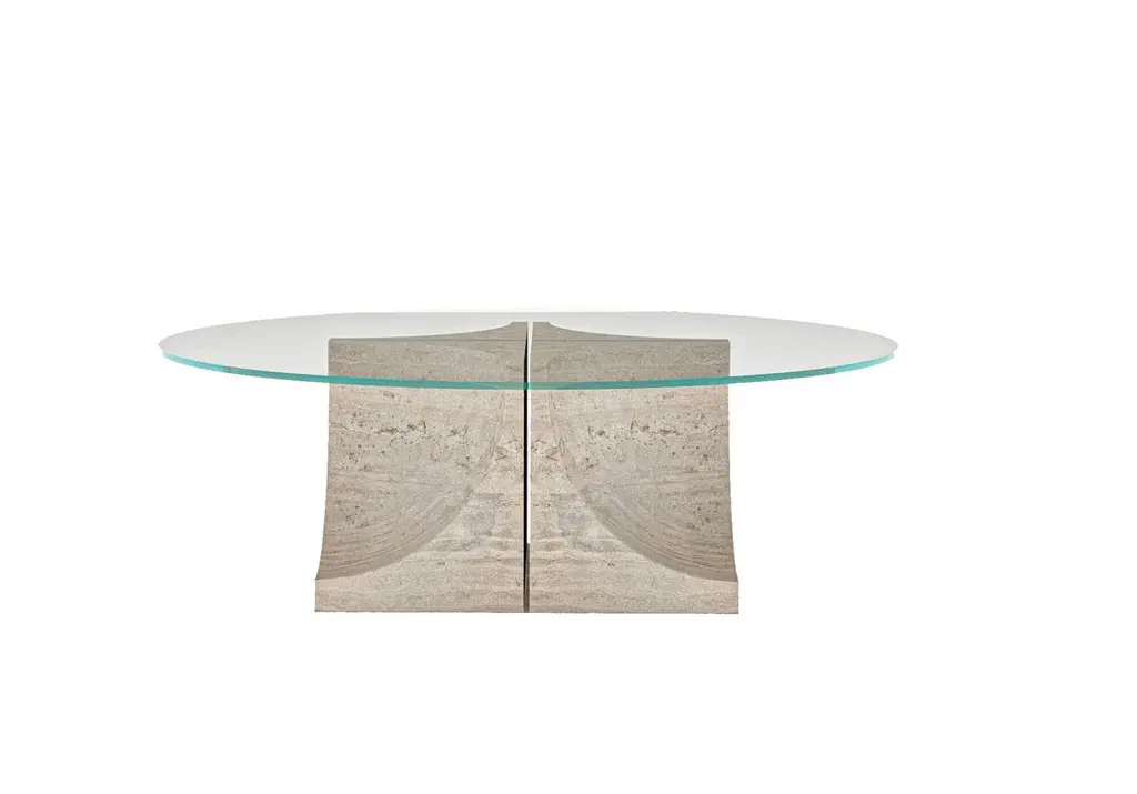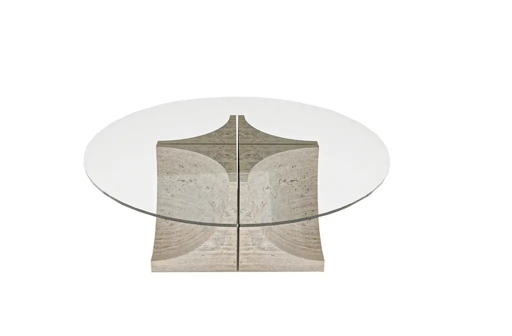 Unique edge center table 4 Legs by CollectorDimensions: D 80 x H 35 cmMaterials: Glass, TravertinoOther materials available.The Collector brand aims to be part of the daily life by fusing furniture to our home routine and lifestyle, that’s why we’ve designed our pieces with the intention to embrace diverse styles and to blend in inside anycontemporary setting.Described by our motto: “built to fit a good IDEA.”, this wide range of product typologies were designed to work in diverse layers of importance. It can work as a center piece of the house, with strong personality or just complementing the background by gently blending in. The result is a clean-lined furnishing collection that can easily be customized to work specifically and according to each unique need, reflecting essentially our traditional methods of furniture manufacturing with accurate Industrial Production methods.We strive to achieve the best quality possible by selecting the best materials and by the constant development of our production processes and manufacturing partnerships.