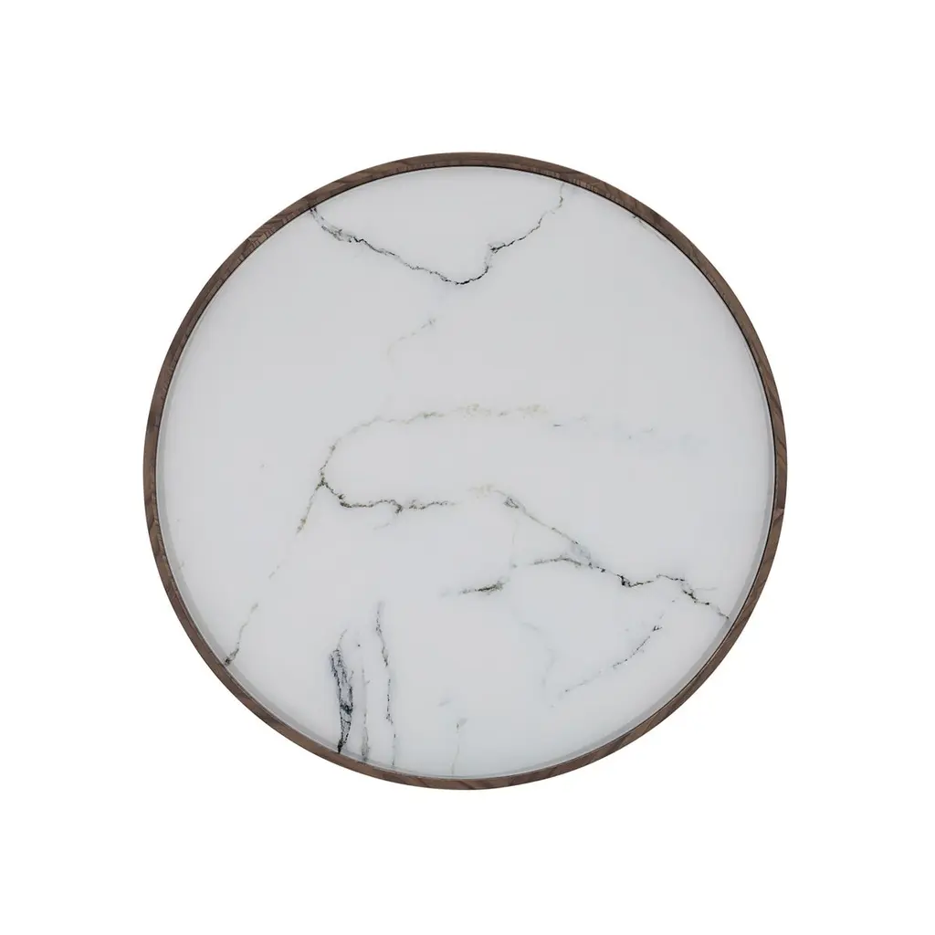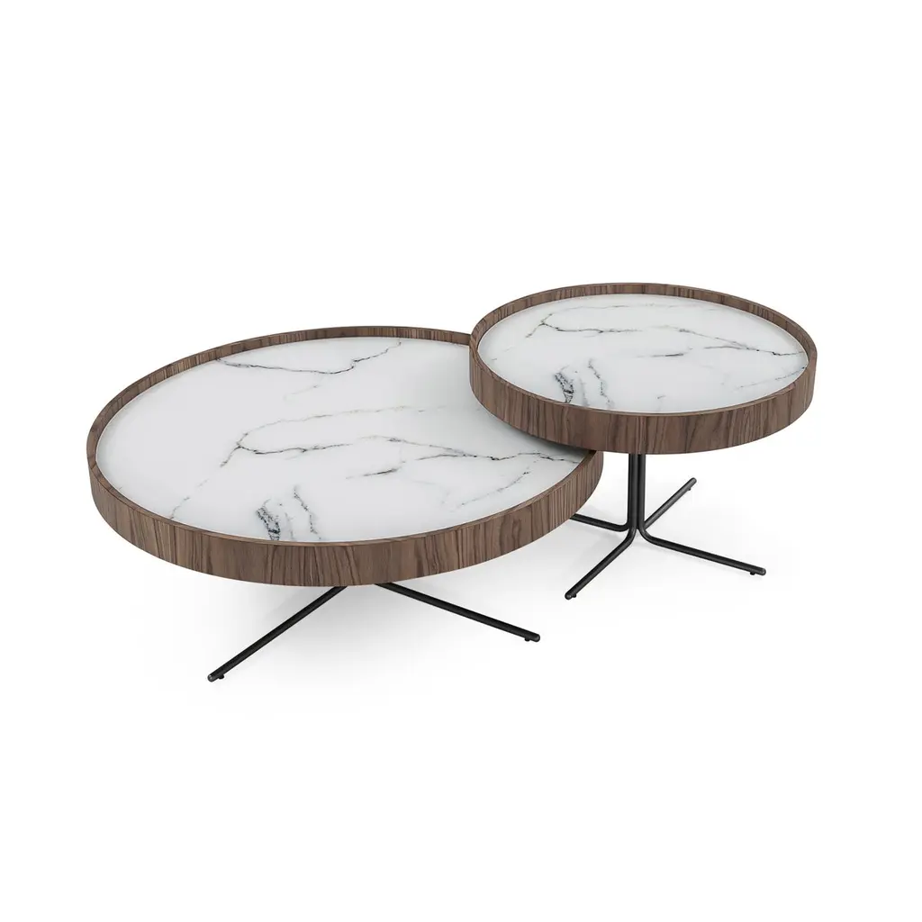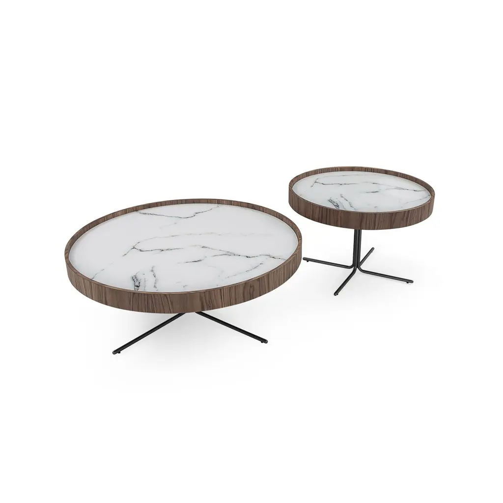 A Régia walnut veneer occasional table designed by Sérgio Batista for Uultis with graphite metallic base and white Carrara marbled glass top. Please check availability prior to purchase.The Regia occasional table blends modern sophistication with a minimalist aesthetic, combining a walnut veneer tray-style frame and a white Carrara marbled glass top for a refined, high-contrast look. Set on a sleek graphite metallic base, this table adds an architectural quality to living rooms, lounges, or offices. Whether used as a stand-alone piece or paired with other Regia tables for a layered arrangement, this versatile coffee table elevates contemporary, modern, or minimalist interiors. Its soft round shape is easy to integrate into any layout, adding visual interest without overpowering a space.Perfectly sized for everyday use, this table offers ample surface for drinks, books, or decor like candles and vases, while the raised rim prevents objects from slipping off. Ideal for anchoring a seating area or creating a focal point, the Regia table is an elegant solution for residential and commercial spaces alike. Place it in front of a sofa to define a conversation zone or use it as a stylish center table in a hotel lobby or office waiting room. Made with sustainable materials and crafted to last, the Regia table reflects a commitment to eco-friendly design without compromising style or quality. Basic assembly is required. Whether styled solo or as part of a set, the Regia occasional table brings timeless elegance and practical function to any room.