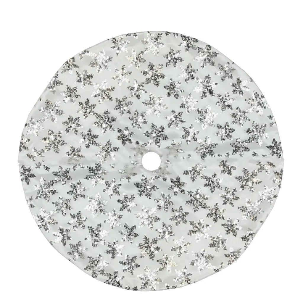 Every Christmas tree needs an extra bit of sparkle. From the Winter's Bloom collection this tree skirt is sure to add some sparkle to your holiday decor. Perfect for all kinds of holiday decorations including tree trimming mantle displays tabletops centerpieces and more! Product Features: White and silver Christmas tree skirt Features a sheer mesh overlay on a white base Accented with silver sequin snowflakes Contains 2 hook and loop fastener closures Recommended for indoor use only Care instructions: spot clean only Dimensions: 20" diameter Material(s): polyester