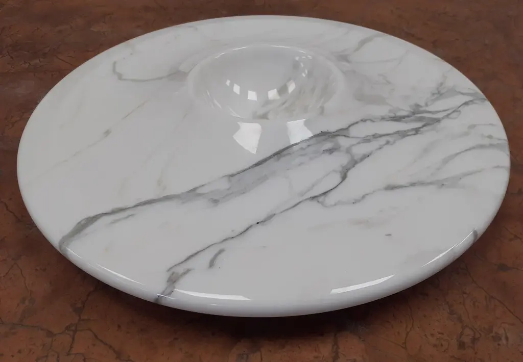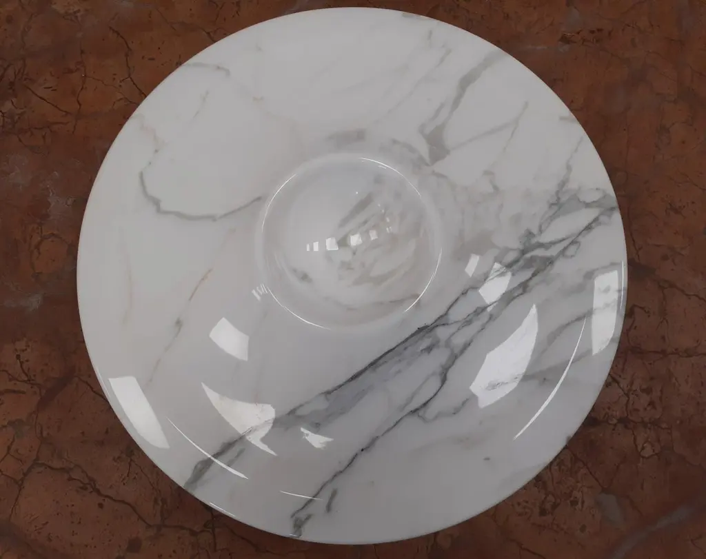"Vesuv" marble centerpiece designed in 1998 by Arch.Adolfo Natalini in White Carrara Red Carpazi.Size: Diameter cm 20 x height 4Materials: White Carrara - Rosso CarpaziDesigner: Adolfo Natalini.