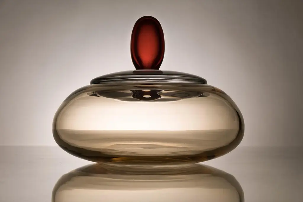 21st century Karim Rashid centerpiece container Murano glass various colors.Designed by Karim Rashid, Kountess is a stately, sculptural jar with a lid. Just like its twin model, Kount, Kountess can also have different uses, whether aesthetic, acting as a stunning centerpiece, or functional, turning into a colorful container. Made of Murano blown glass, the jar plays with unusual combinations of bright colors that can be personalized to respond to everyone’s need and taste colors that can be personalized to respond to individual needs and tastes.Available colors:Transparent blown glassTransparent Blown glass 01. crystal 02. milky white 03. honey 04. ruby Venice 05. amethist pink 06. coffee 07. amber yellow 08. Capri yellow 09. mandarin orange 10. oriental red 11. green apple 12. Caribbean green 13. green lagoon 14. emerald green15. blue mediterranean 16. deep blue 17. ocean blue 18. Florence purple 19. steel grey 20. black gondola Special processing techniques21. gold leaf.