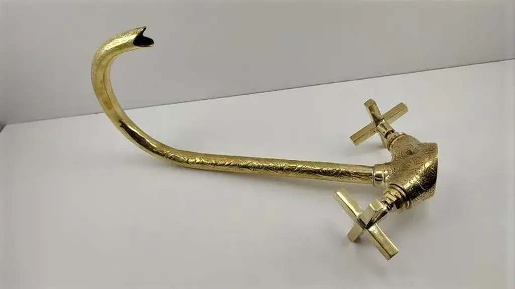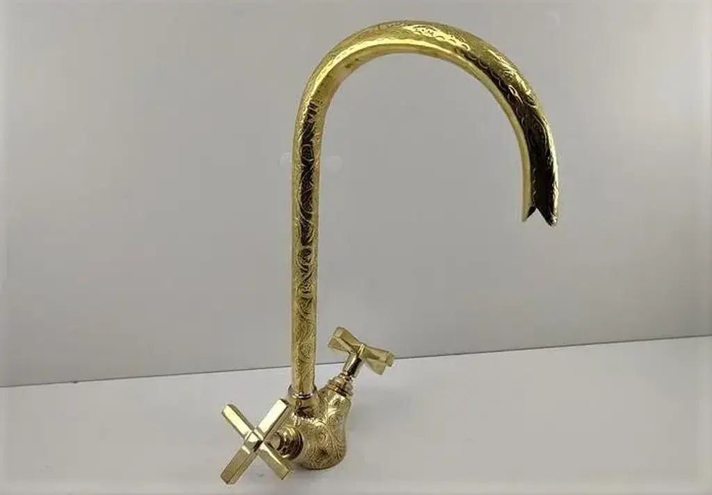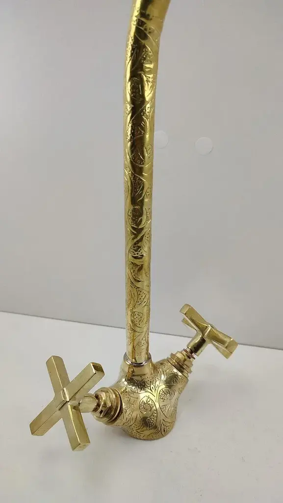 Adaptors and installation accessories (Included) Elevate your living space with the allure of Moroccan craftsmanship and timeless design through this stunning Moroccan Handmade Swan Neck Brass Faucet. Crafted by skilled artisans, this faucet embodies the intricate beauty of Moroccan architecture, adding a touch of exotic charm to any environment. Made from high-quality brass, the faucet boasts a swan neck design that gracefully curves, evoking a sense of fluidity and grace. The warm, golden tones of the brass lend an air of sophistication, while the handcrafted details showcase the dedication and expertise that went into its creation. Whether adorning your bathroom or kitchen, this faucet is more than just a functional fixture; it's a work of art that seamlessly combines form and function. The single lever handle ensures effortless water flow control, while the easy installation process allows you to enjoy its elegance without hassle. Indulge in the spirit of Moroccan aesthetics and add a touch of opulence to your home with this Moroccan Handmade Swan Neck Brass Faucet. Experience the fusion of tradition and modernity as this piece becomes the centerpiece of your space, evoking the captivating ambiance of Moroccan culture every time you use it. - Overall Height: 10-1/4" (measured from the counter top to the highest part of the faucet) - Spout Height: 7" (measured from the counter top to the spout's outlet) - Spout Reach: 7" (measured from the center of the faucet base to the center of the spout's outlet) - Faucet Centers (Distance Between Handle Installation Holes): 6"