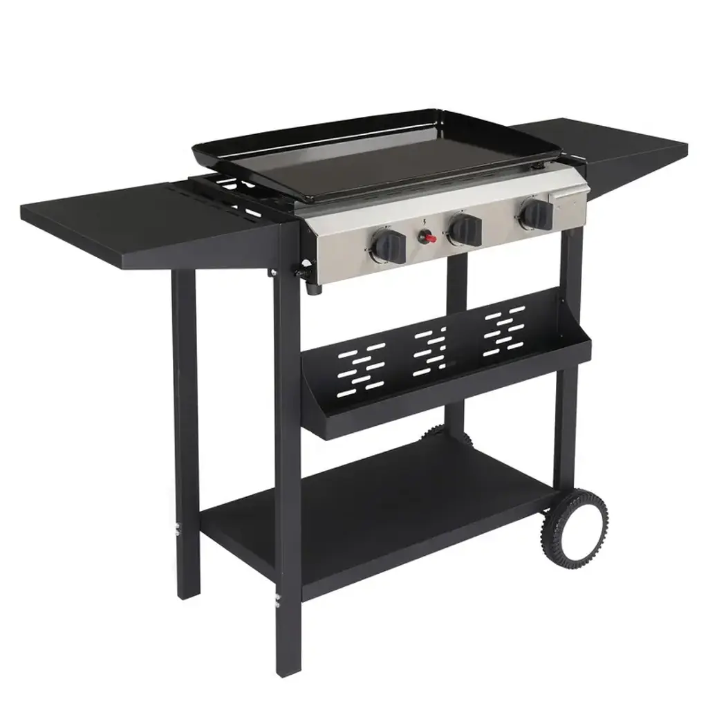 Introductions: Elevate your outdoor cooking with this 3-Burner Flat Top Gas Griddle Cooking Station. Whether you're flipping burgers, searing steaks, or sautéing vegetables, this cooking station is equipped to deliver restaurant-style results in the comfort of your backyard. The ceramic-coated cast iron pan ensures a non-stick experience, promoting healthier meals with minimal oil. With its durable construction and precision heat control, this cooking station is set to be the centerpiece of your next outdoor barbecue or family cookout.Features: 1. Restaurant-Quality Cooking: Enjoy a spacious flat top griddle surface sized 23.2 x 14.2 inch, ideal for versatile grilling and gourmet food preparation. 2. Non-Stick Ceramic Coated Pan: Our griddle features a ceramic-coated cast iron pan, enabling you to cook with less oil while ensuring a breeze of a cleanup—simply wipe away the mess! 3. Convenient Storage: Keep spices, utensils, and ingredients within arm's reach with a spice rack at front and spacious shelves at both sides, making meal prep seamless and organized. 4. Precision Heat Control: Three independent burners provide total command over your cooking temperature, allowing for precise and varied heat zones across the griddle. 5. Effortless Cleaning: Our griddle station boasts easy-clean design with an oil drip hole and a slide-out grease cup, ensuring you spend less time cleaning and more time enjoying your culinary creations.Specifications: 1. Material: Iron, Stainless Steel, Plastic 2. Overall Dimensions: (45.9 x 17.7 x 33.5) in / (116.5 x 45 x 85) cm 3. Enamel Iron Griddle Size: (23.2 x 14.2) in / (59 x 36) cm 4. Side Shelf Dimensions: (11 x 13.6) in / (28 x 34.5) cm 5. Bottom Shelf Dimensions: (24 x 13.4) in / (61 x 34) cm 6. Ground Clearance: 4.9 in / 12.5 cm 7. Spice Rack Dimensions: (24.4 x 3.5) in / (62 x 9) cmPackage Includes: 1 x 3-Burner Flat Top Gas Griddle Cooking Station