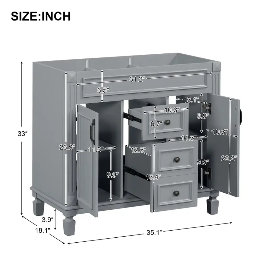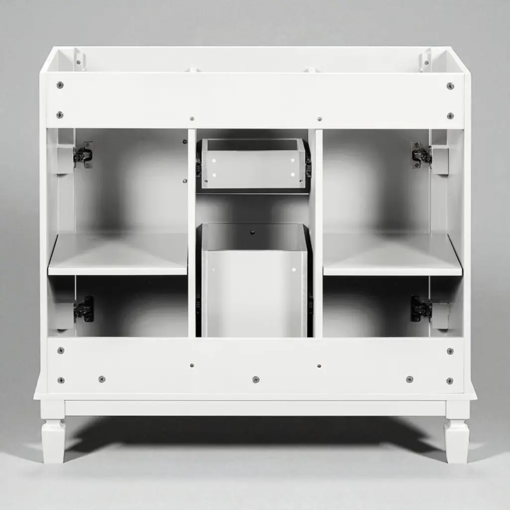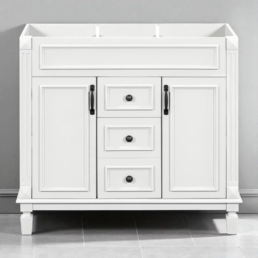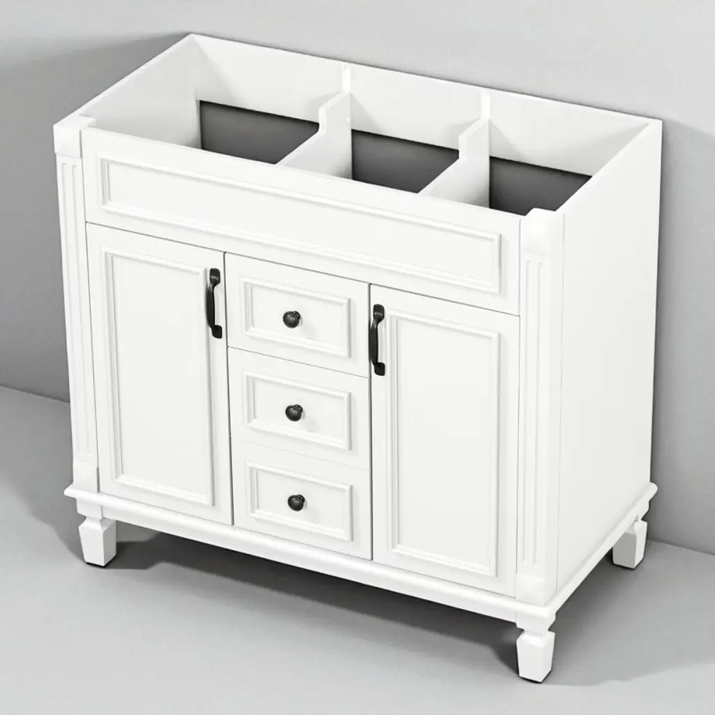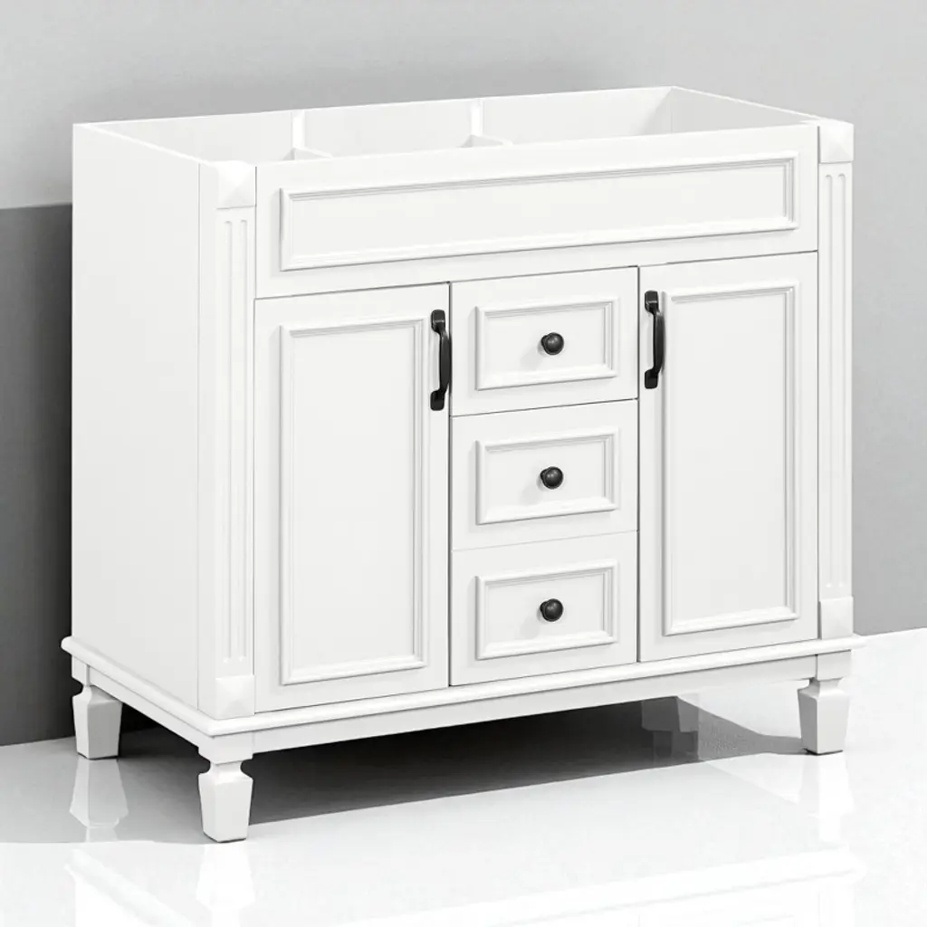 Product Overview This 36" freestanding bathroom vanity cabinet combines sleek modern design with durable construction for a stylish and functional bathroom upgrade. Made with a solid wood frame and high-quality MDF panels, it offers both strength and long-lasting performance. With two soft-closing doors and two spacious drawers, this cabinet provides the perfect concealed storage solution for keeping your bathroom essentials organized, protected, and within easy reach. Product Features High-Quality Construction: Built with a solid wood frame for enhanced stability and durability. The remaining panels are made from premium MDF with a water-resistant painted finish that resists humidity and everyday wear.Ample Concealed Storage: The two-door cabinet and dual drawers offer generous space for toiletries, towels, and bathroom supplies. Keep your items clean, dry, and neatly tucked away behind smooth soft-close doors and drawer fronts.Modern Freestanding Design: With its clean lines and white finish, this vanity enhances any bathroom décor. The refined cabinet style provides a sophisticated look with practical functionality, making it a centerpiece in your space.Soft-Closing Hardware: Equipped with soft-closing hinges and drawer sliders for a quiet, seamless user experience that minimizes wear over time and increases safety in daily use.Easy to Assemble: All parts are clearly labeled, and pre-drilled holes ensure a smooth assembly process. Simply follow the included instruction manual to complete the installation with minimal effort. Specifications Product Type: Bathroom Vanity Cabinet (Sink Not Included)Color: WhiteStyle: ModernMain Material: Solid Wood Frame + MDF PanelsProduct Dimensions: 35.9"L x 18.1"W x 33"HPackage Dimensions: 42"L x 23"W x 13"HNumber of Drawers: 2Weight Capacity: Overall: 300 lbs | Panel: 50 lbs | Drawer: 50 lbsAssembly Required: YesChargeable Weight: 79.37 lbs Suitable Scenarios Ideal for modern residential bathrooms in homes or apartments.Perfect for guest bathrooms, powder rooms, or primary bathroom renovations.Works well with a variety of sink tops to match your preferred style. Notes This listing is for the cabinet only. Sink top and faucet are not included.Assembly is required. All parts, hardware, and instructions are included in the package.Keep the cabinet away from prolonged water exposure to preserve its finish.