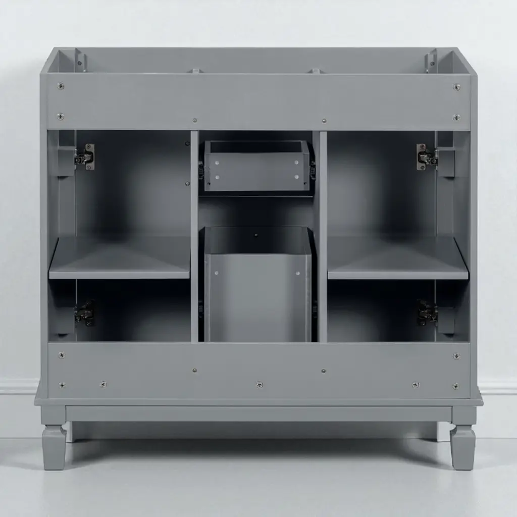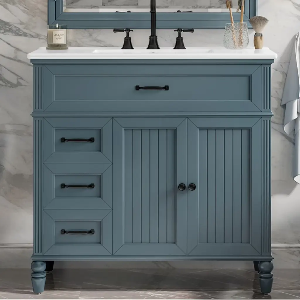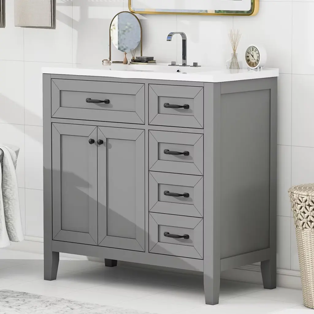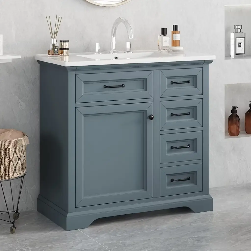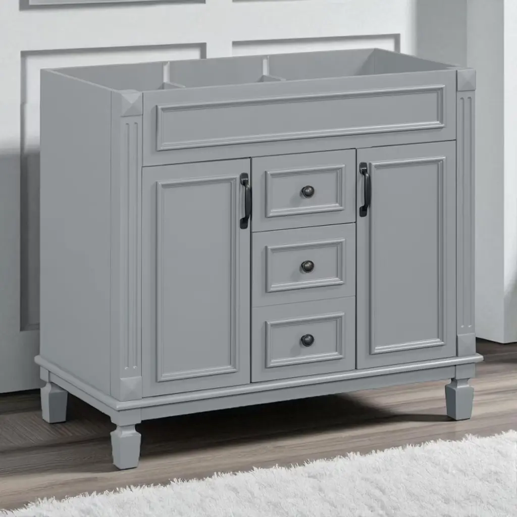 Product Overview This 36" freestanding bathroom vanity cabinet combines sleek modern design with durable construction for a stylish and functional bathroom upgrade. Made with a solid wood frame and high-quality MDF panels, it offers both strength and long-lasting performance. With two soft-closing doors and two spacious drawers, this cabinet provides the perfect concealed storage solution for keeping your bathroom essentials organized, protected, and within easy reach. Product Features High-Quality Construction: Built with a solid wood frame for enhanced stability and durability. The remaining panels are made from premium MDF with a water-resistant painted finish that resists humidity and everyday wear.Ample Concealed Storage: The two-door cabinet and dual drawers offer generous space for toiletries, towels, and bathroom supplies. Keep your items clean, dry, and neatly tucked away behind smooth soft-close doors and drawer fronts.Modern Freestanding Design: With its clean lines and white finish, this vanity enhances any bathroom décor. The refined cabinet style provides a sophisticated look with practical functionality, making it a centerpiece in your space.Soft-Closing Hardware: Equipped with soft-closing hinges and drawer sliders for a quiet, seamless user experience that minimizes wear over time and increases safety in daily use.Easy to Assemble: All parts are clearly labeled, and pre-drilled holes ensure a smooth assembly process. Simply follow the included instruction manual to complete the installation with minimal effort. Specifications Product Type: Bathroom Vanity Cabinet (Sink Not Included)Color: WhiteStyle: ModernMain Material: Solid Wood Frame + MDF PanelsProduct Dimensions: 35.9"L x 18.1"W x 33"HPackage Dimensions: 42"L x 23"W x 13"HNumber of Drawers: 2Weight Capacity: Overall: 300 lbs | Panel: 50 lbs | Drawer: 50 lbsAssembly Required: YesChargeable Weight: 79.37 lbs Suitable Scenarios Ideal for modern residential bathrooms in homes or apartments.Perfect for guest bathrooms, powder rooms, or primary bathroom renovations.Works well with a variety of sink tops to match your preferred style. Notes This listing is for the cabinet only. Sink top and faucet are not included.Assembly is required. All parts, hardware, and instructions are included in the package.Keep the cabinet away from prolonged water exposure to preserve its finish.