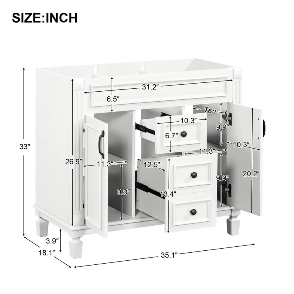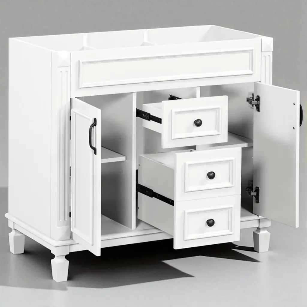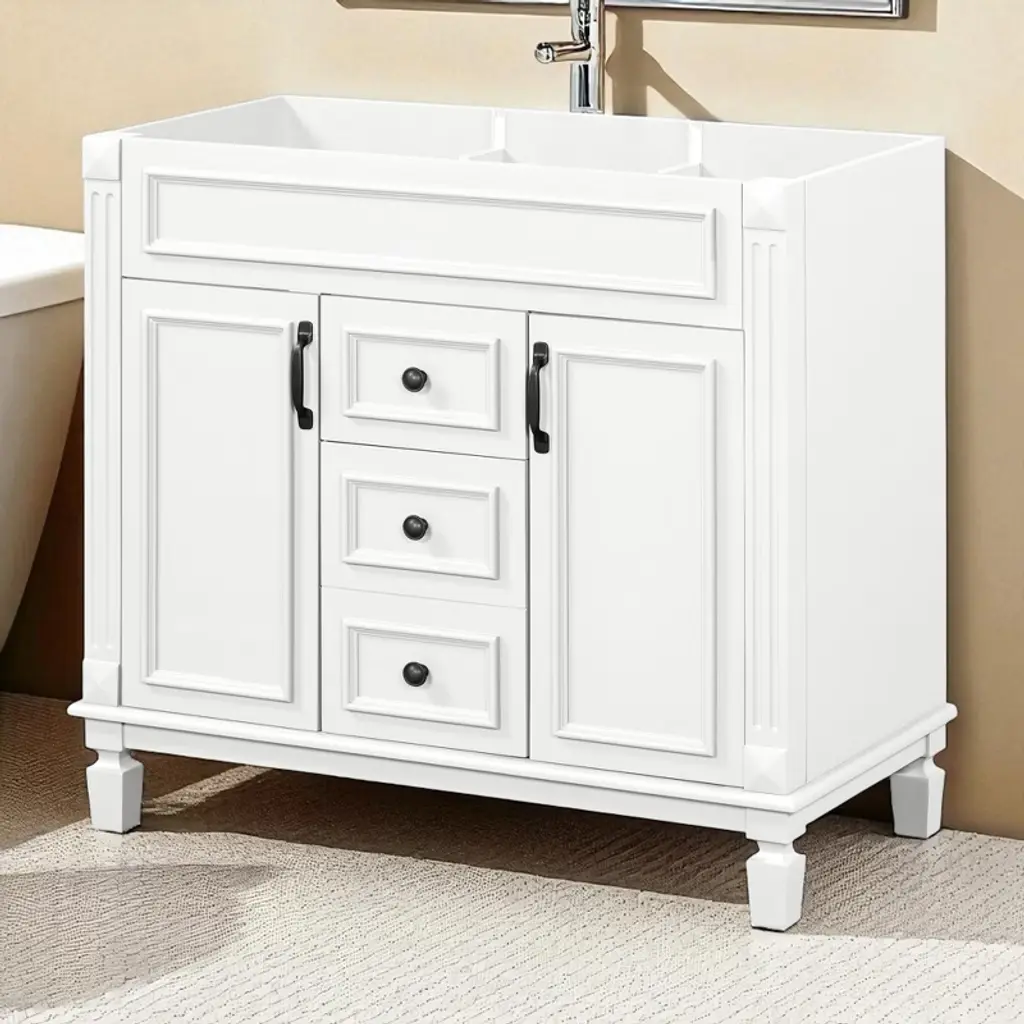 Product Overview This 36" freestanding bathroom vanity cabinet combines sleek modern design with durable construction for a stylish and functional bathroom upgrade. Made with a solid wood frame and high-quality MDF panels, it offers both strength and long-lasting performance. With two soft-closing doors and two spacious drawers, this cabinet provides the perfect concealed storage solution for keeping your bathroom essentials organized, protected, and within easy reach. Product Features High-Quality Construction: Built with a solid wood frame for enhanced stability and durability. The remaining panels are made from premium MDF with a water-resistant painted finish that resists humidity and everyday wear.Ample Concealed Storage: The two-door cabinet and dual drawers offer generous space for toiletries, towels, and bathroom supplies. Keep your items clean, dry, and neatly tucked away behind smooth soft-close doors and drawer fronts.Modern Freestanding Design: With its clean lines and white finish, this vanity enhances any bathroom décor. The refined cabinet style provides a sophisticated look with practical functionality, making it a centerpiece in your space.Soft-Closing Hardware: Equipped with soft-closing hinges and drawer sliders for a quiet, seamless user experience that minimizes wear over time and increases safety in daily use.Easy to Assemble: All parts are clearly labeled, and pre-drilled holes ensure a smooth assembly process. Simply follow the included instruction manual to complete the installation with minimal effort. Specifications Product Type: Bathroom Vanity Cabinet (Sink Not Included)Color: WhiteStyle: ModernMain Material: Solid Wood Frame + MDF PanelsProduct Dimensions: 35.9"L x 18.1"W x 33"HPackage Dimensions: 42"L x 23"W x 13"HNumber of Drawers: 2Weight Capacity: Overall: 300 lbs | Panel: 50 lbs | Drawer: 50 lbsAssembly Required: YesChargeable Weight: 79.37 lbs Suitable Scenarios Ideal for modern residential bathrooms in homes or apartments.Perfect for guest bathrooms, powder rooms, or primary bathroom renovations.Works well with a variety of sink tops to match your preferred style. Notes This listing is for the cabinet only. Sink top and faucet are not included.Assembly is required. All parts, hardware, and instructions are included in the package.Keep the cabinet away from prolonged water exposure to preserve its finish.