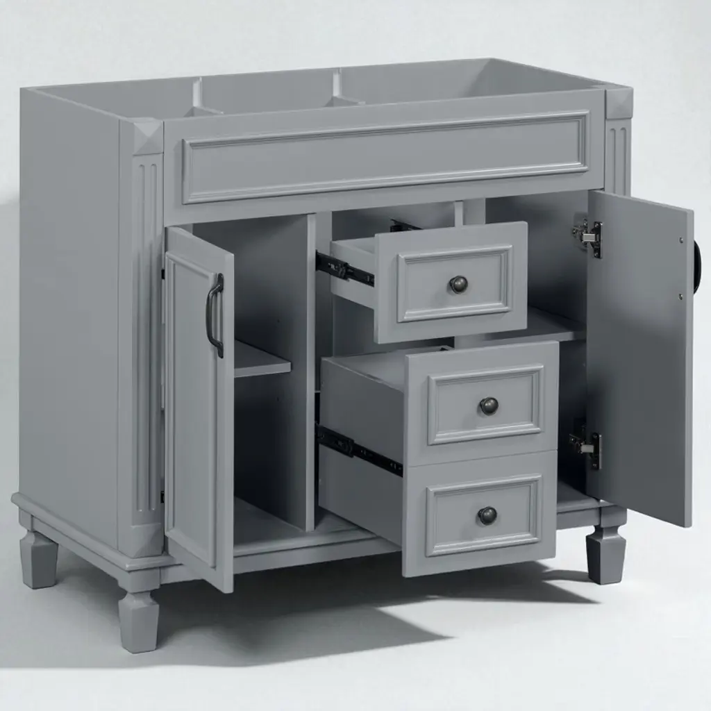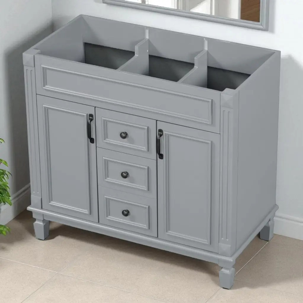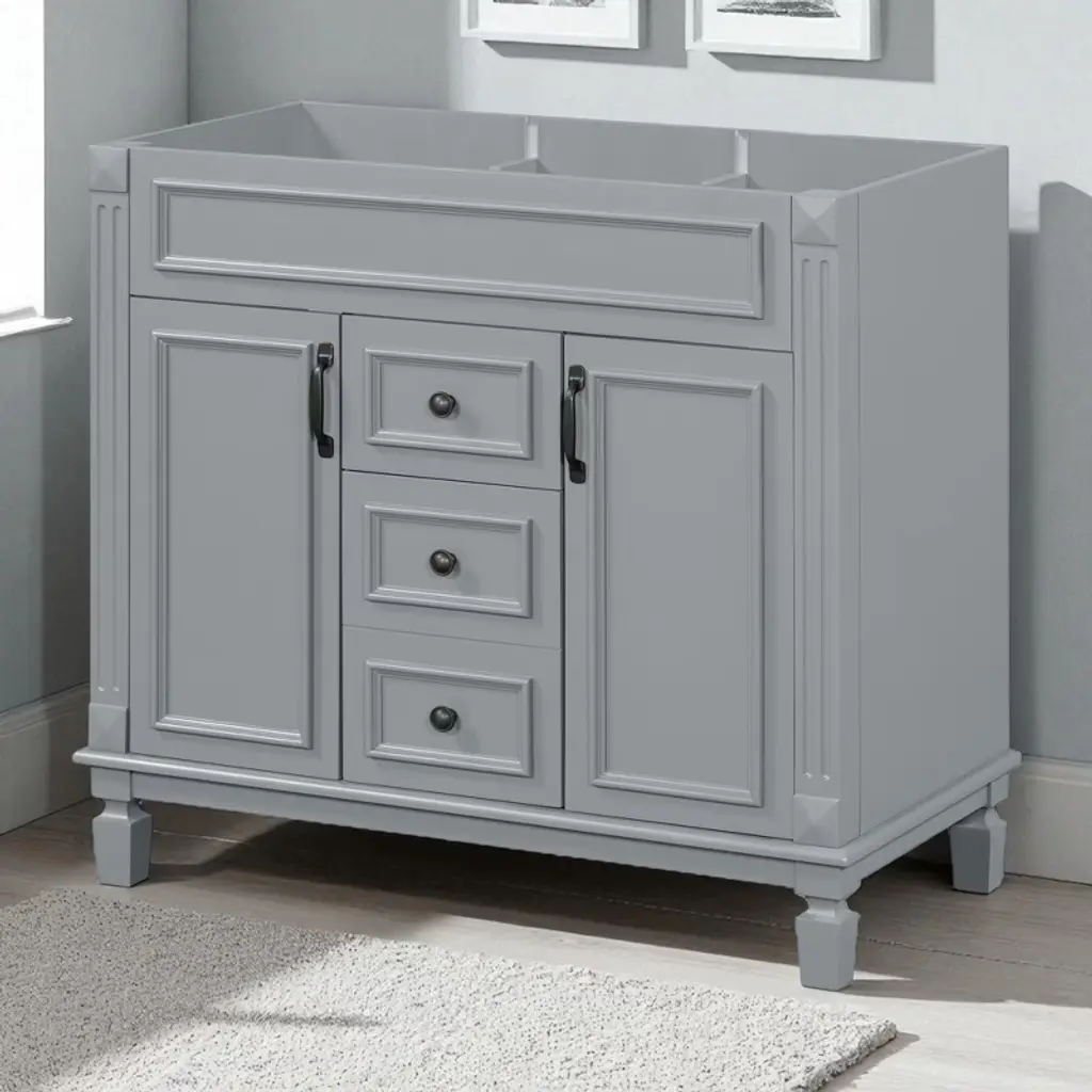 Product Overview This 36" freestanding bathroom vanity cabinet combines sleek modern design with durable construction for a stylish and functional bathroom upgrade. Made with a solid wood frame and high-quality MDF panels, it offers both strength and long-lasting performance. With two soft-closing doors and two spacious drawers, this cabinet provides the perfect concealed storage solution for keeping your bathroom essentials organized, protected, and within easy reach. Product Features High-Quality Construction: Built with a solid wood frame for enhanced stability and durability. The remaining panels are made from premium MDF with a water-resistant painted finish that resists humidity and everyday wear.Ample Concealed Storage: The two-door cabinet and dual drawers offer generous space for toiletries, towels, and bathroom supplies. Keep your items clean, dry, and neatly tucked away behind smooth soft-close doors and drawer fronts.Modern Freestanding Design: With its clean lines and white finish, this vanity enhances any bathroom décor. The refined cabinet style provides a sophisticated look with practical functionality, making it a centerpiece in your space.Soft-Closing Hardware: Equipped with soft-closing hinges and drawer sliders for a quiet, seamless user experience that minimizes wear over time and increases safety in daily use.Easy to Assemble: All parts are clearly labeled, and pre-drilled holes ensure a smooth assembly process. Simply follow the included instruction manual to complete the installation with minimal effort. Specifications Product Type: Bathroom Vanity Cabinet (Sink Not Included)Color: WhiteStyle: ModernMain Material: Solid Wood Frame + MDF PanelsProduct Dimensions: 35.9"L x 18.1"W x 33"HPackage Dimensions: 42"L x 23"W x 13"HNumber of Drawers: 2Weight Capacity: Overall: 300 lbs | Panel: 50 lbs | Drawer: 50 lbsAssembly Required: YesChargeable Weight: 79.37 lbs Suitable Scenarios Ideal for modern residential bathrooms in homes or apartments.Perfect for guest bathrooms, powder rooms, or primary bathroom renovations.Works well with a variety of sink tops to match your preferred style. Notes This listing is for the cabinet only. Sink top and faucet are not included.Assembly is required. All parts, hardware, and instructions are included in the package.Keep the cabinet away from prolonged water exposure to preserve its finish.