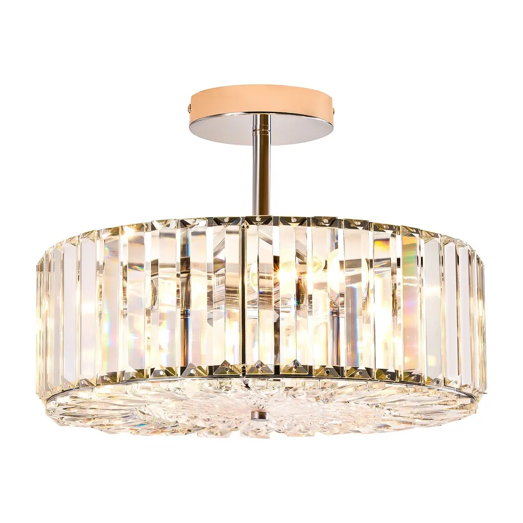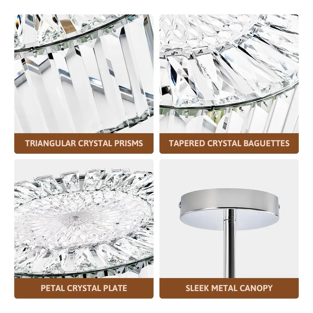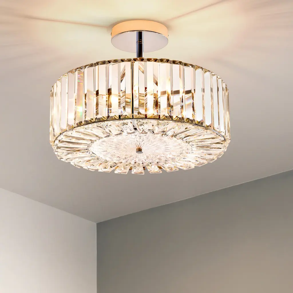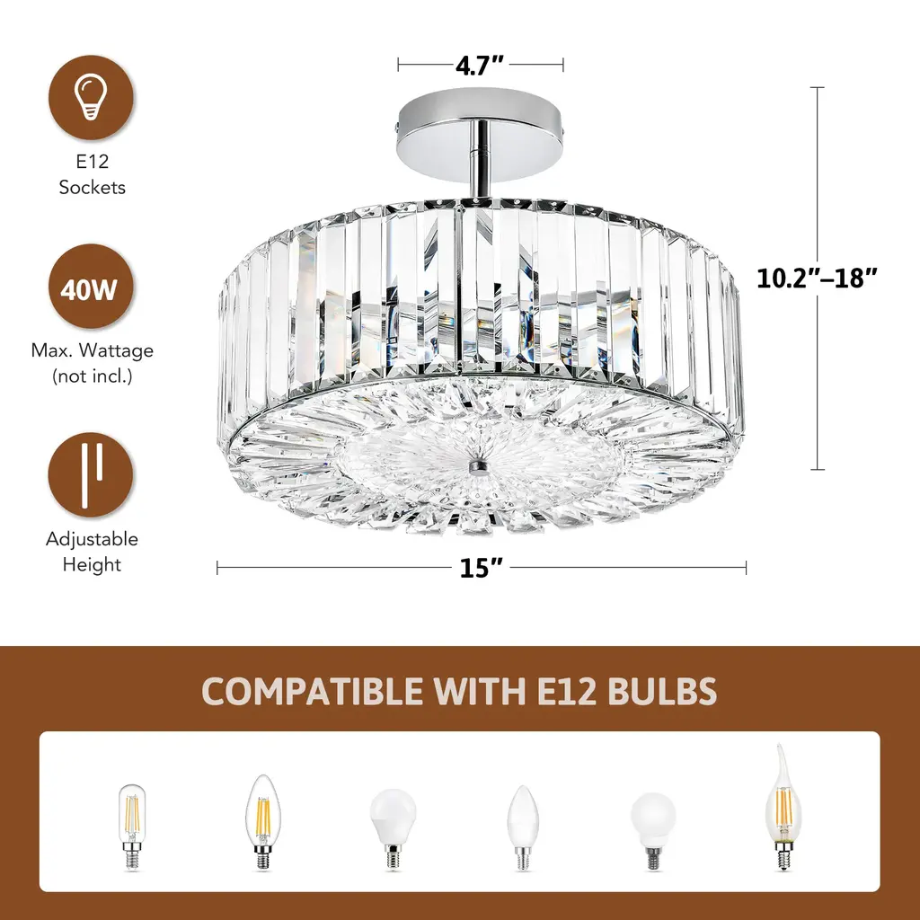 Sparkling and exquisitely translucent, this crystal ceiling light is a masterpiece of elegance, with each finely cut crystal reflecting light in a dazzling array of colors. The fixture exudes sophistication, turning your room into a haven of shimmering beauty. Whether illuminated or not, it serves as a striking centerpiece, drawing the eye with its stunning design. Compatible with CFL, LED, and incandescent bulbs up to 60W on each E12 socket (bulbs not included), and measuring 15" in diameter, it's perfect for adding a touch of luxury to hallways, stairways, and entryways. Illuminate your space with the refined glamour of this crystal light.