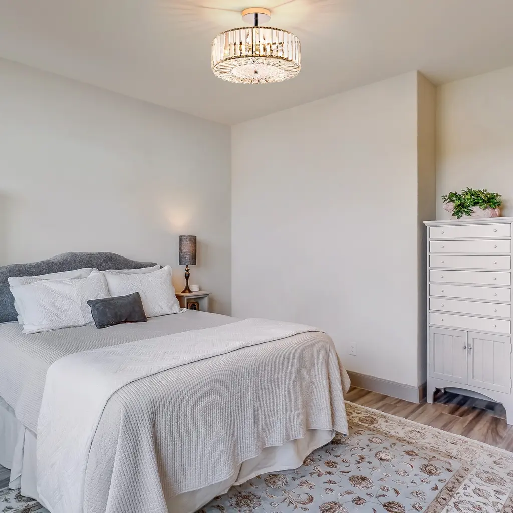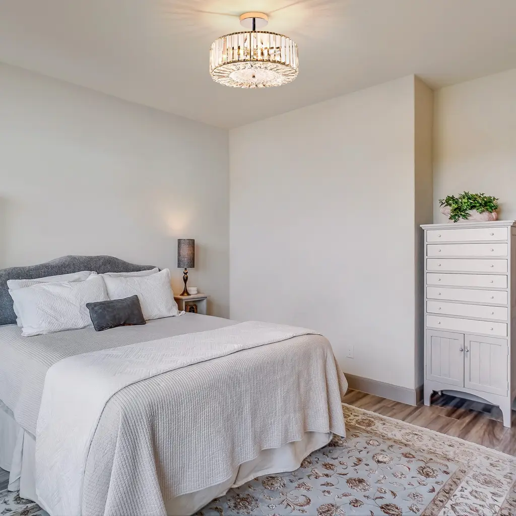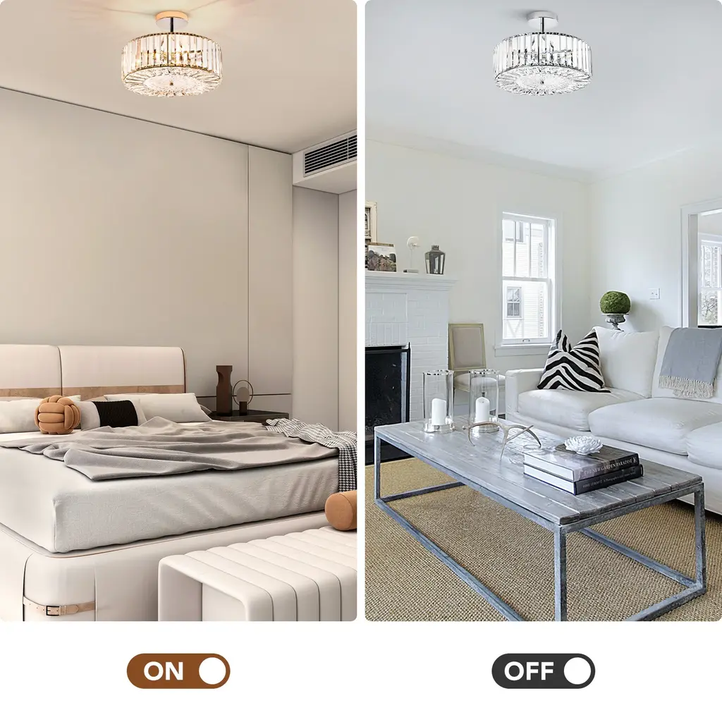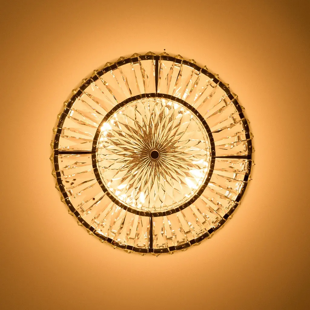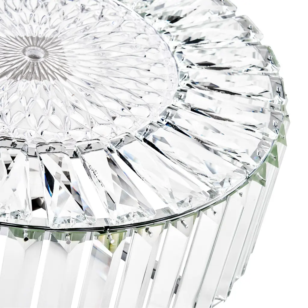 Sparkling and exquisitely translucent, this crystal ceiling light is a masterpiece of elegance, with each finely cut crystal reflecting light in a dazzling array of colors. The fixture exudes sophistication, turning your room into a haven of shimmering beauty. Whether illuminated or not, it serves as a striking centerpiece, drawing the eye with its stunning design. Compatible with CFL, LED, and incandescent bulbs up to 60W on each E12 socket (bulbs not included), and measuring 15" in diameter, it's perfect for adding a touch of luxury to hallways, stairways, and entryways. Illuminate your space with the refined glamour of this crystal light.