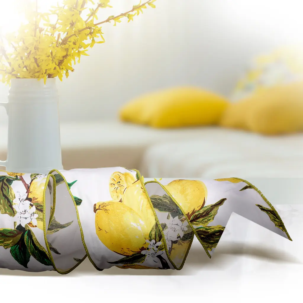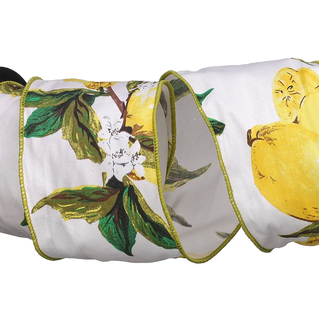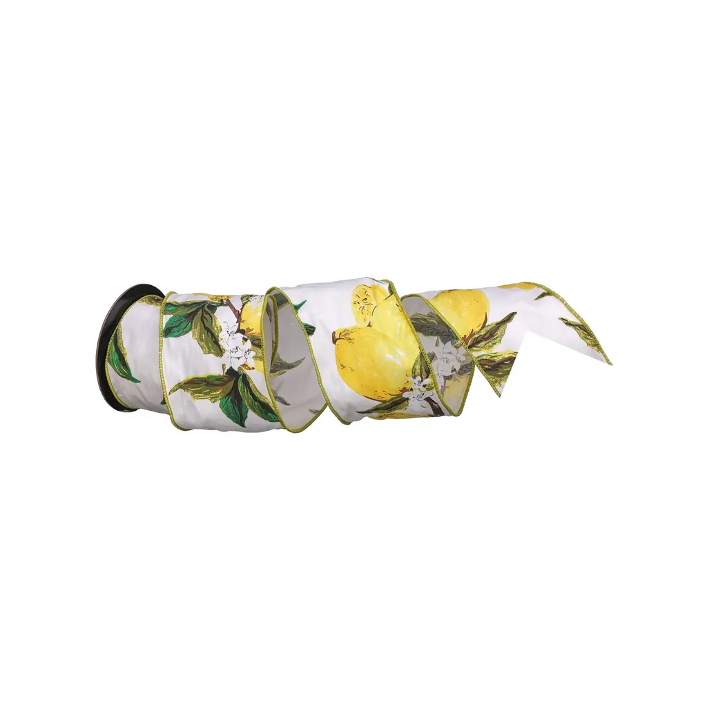 Bring a festive and bright look to your spring decor with this wonderful 4"x 10Y Lemon and Leaf Ribbon. In hues of yellow, accent your home with spools of ribbon by creating bows and centerpieces. Also, string along a stair banister for added flair. The sewn wire edges allow you to bend and shape your beautiful creations. We recommended saving unused ribbons for future projects. Measures 4" wide x 10 yards.