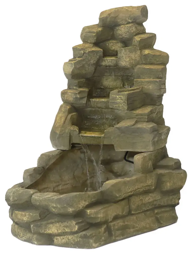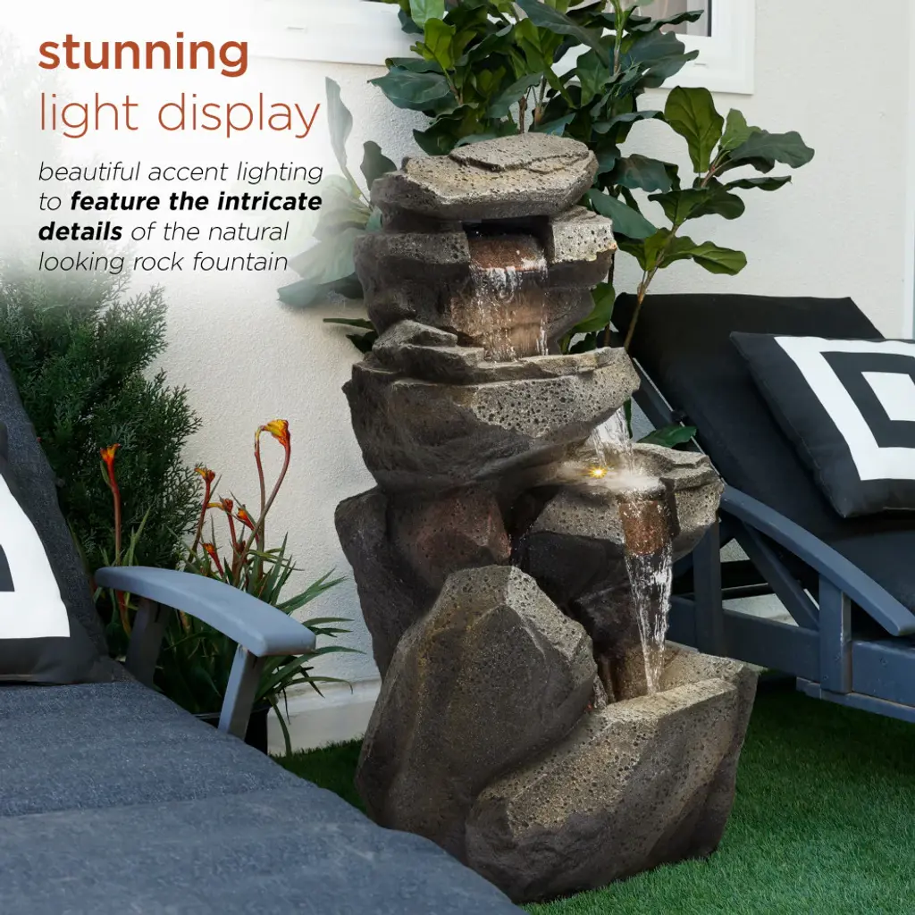Transform your outdoor space with the Alpine Corporation WIN1184 40" Outdoor 3-Tiered Rock Waterfall Fountain with LED Lights. Featuring a natural stone appearance, this cascading water feature brings the tranquil sounds of flowing water to gardens, patios, yards, and outdoor seating areas. Designed with five tiers, water flows gently from top to bottom, creating a soothing waterfall effect that promotes relaxation while enhancing any setting. The built-in LED lights illuminate the cascading water, providing a soft, ambient glow that adds beauty during the day and night. Constructed from durable weather-resistant resin, this outdoor fountain maintains its detailed rock-like texture while withstanding outdoor elements. The lightweight design allows for easy placement and repositioning wherever you need a peaceful retreat. Equipped with a built-in pump, this rock waterfall fountain ensures continuous water circulation, reducing maintenance and keeping the water fresh. With a simple plug-and-play setup, installation is quick and hassle-free"”just fill with water, plug it in, and enjoy. Perfect as a decorative centerpiece or relaxation spot, this cascading water feature adds a natural, tranquil ambiance to gardens, patios, courtyards, or decks, making it an elegant addition to any outdoor décor. With two years manufacturer''s Support from date of purchase.