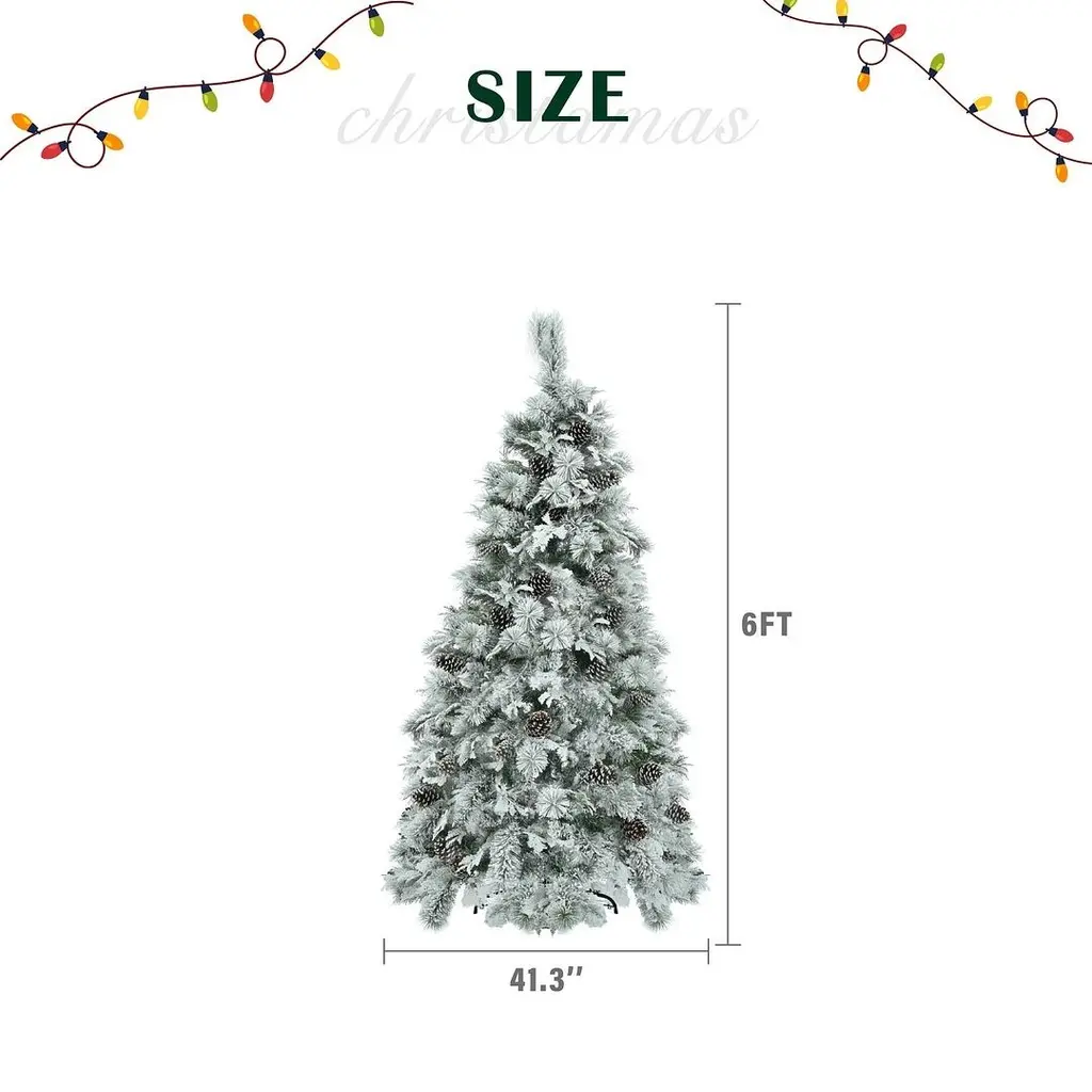 Transform your home into a dazzling winter wonderland with this 4/6/7.5FT Pre-Lit Snow Flocked Christmas Tree, perfect for creating an enchanting holiday atmosphere. Designed with 170-745 lush, snow-dusted branch tips, this artificial tree beautifully mimics the appearance of a natural spruce, enhanced with pine cones for added charm. Adorned with 120-450 multi-color LED lights, it shines with 11 mesmerizing flashing modes, making it a magical centerpiece for your living room, office, or store. Crafted with a sturdy metal base and durable mixed PE and PVC branches, this tree ensures long-lasting use and effortless setup. Whether you’re decorating for Christmas parties or family gatherings, its stunning snow-covered look and vibrant lights will bring joy to your celebrations. Enjoy easy assembly and storage, making it a hassle-free addition to your holiday décor.Features:Specifications:This snow-flocked Christmas tree with its vibrant lights and charming pine cone accents is the perfect way to bring the holiday spirit into your home. Its realistic design and easy setup make decorating for the season a breeze.