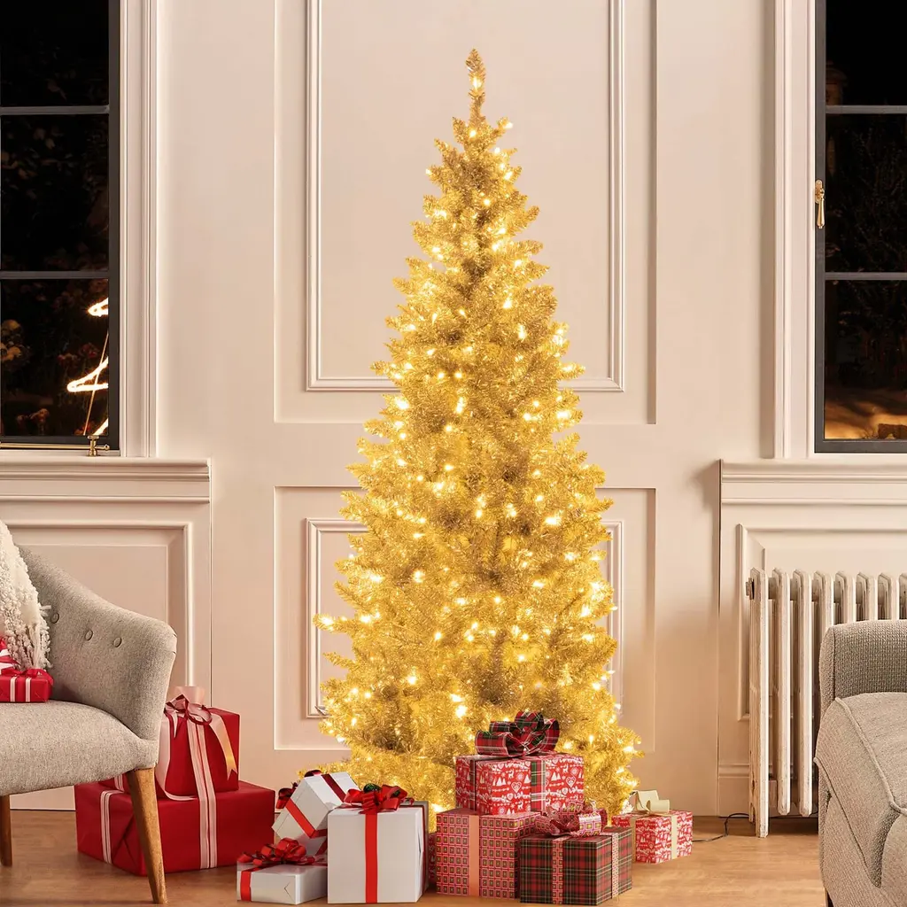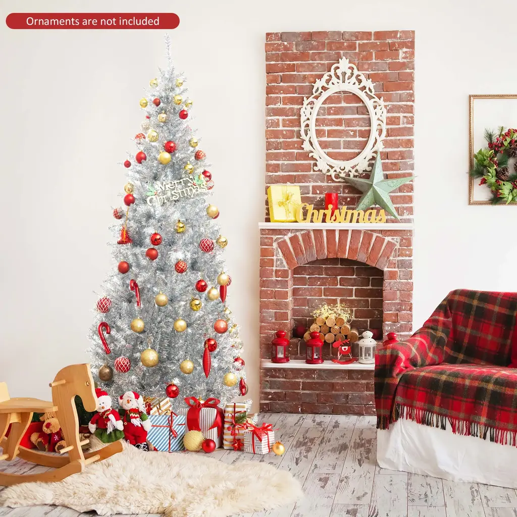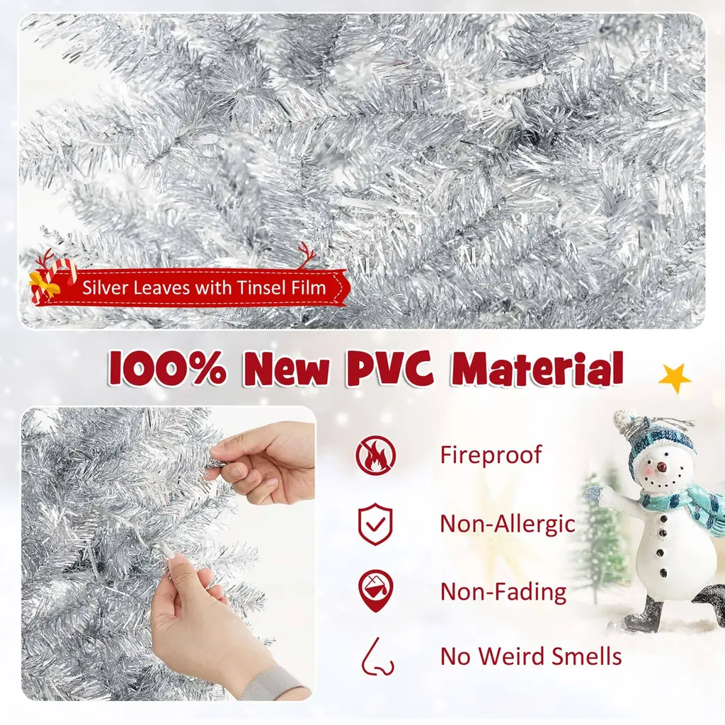 Illuminate your holiday season with our 6/7 ft tinsel Christmas tree! It is adorned with 790/1030 shimmering branch tips crafted from lustrous silver tinsel films. This stunning centerpiece creates an enchanting & joyous atmosphere, perfect for any festive gathering. The lush Christmas tree boasts 300/400 warm white LED lights, not only captivating the eye but also conserving energy & lasting longer than traditional incandescent lights. Crafted from 100% new PVC, the non-allergic Xmas tree offers exceptional safety, durability & resistance to both fire & fading. The Xmas tree has more premium details. Its hinged connections simplify setup, while the upgraded metal stand with a preinstalled bolt avoids aligning & reduces the risk of any assembly mishaps. With its slender pencil shape, our Christmas tree effortlessly nestles into any corner, the inclusion of 2 pairs of gloves makes fluffing a breeze. Embrace the magic & versatility of our magnificent Xmas tree, perfect for homes, shops, malls, and more. Merry Christmas! Features:Specification