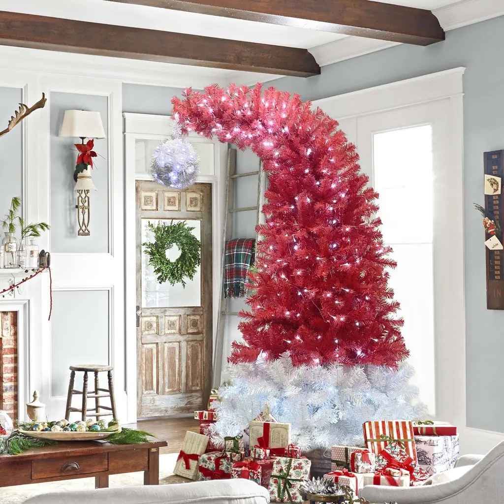 6Ft Hinged Fir Artificial Fir Bent Top Christmas Tree - 7 Foot - White/red
