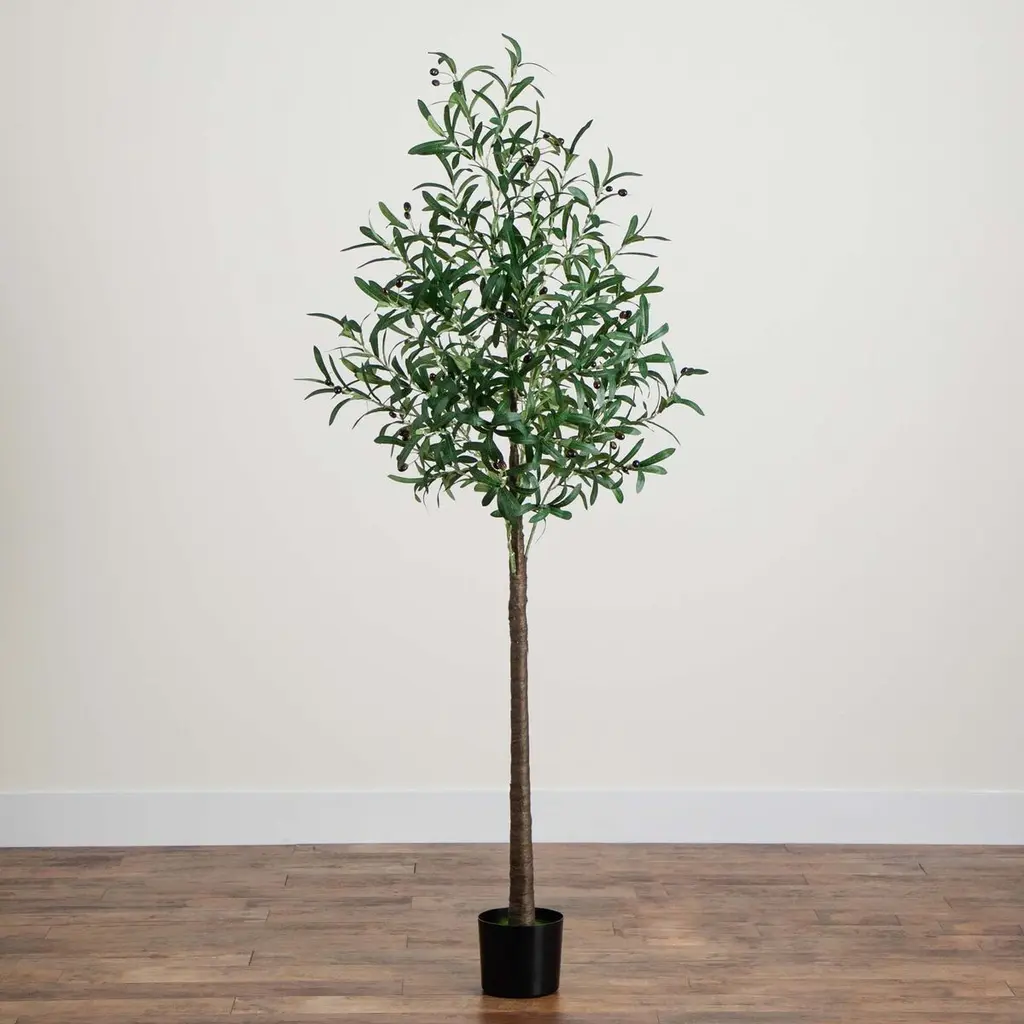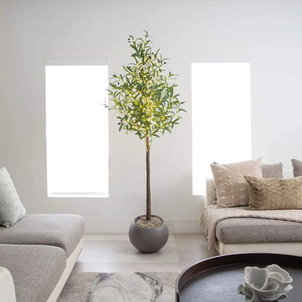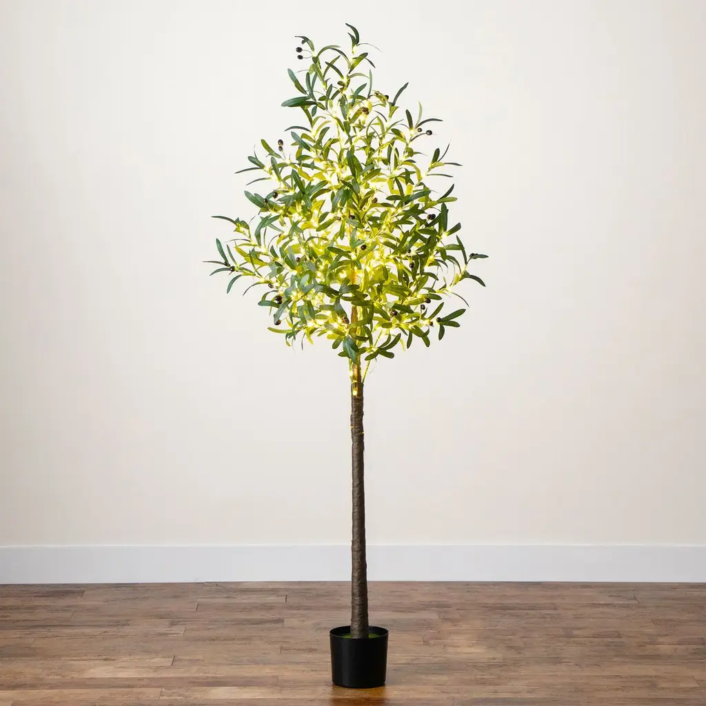 How about a new kind of olive tree? Bring a timeless look to your space with this artificial olive tree, inspired by the Mediterranean. The leaves are accented by lifelike faux dark olives, adding a touch of authenticity. Crafted from high-quality materials, the branches can be bent to fit your space for a custom look. Pre-lit with 300 warm LED lights, it creates a soft, magical glow wherever it's displayed. Standing 6' on a sturdy stand, it's perfect for adding a touch of life to any area in need of some greenery. Great for any room in need of a centerpiece, we love it in nooks, living rooms, and kitchens.