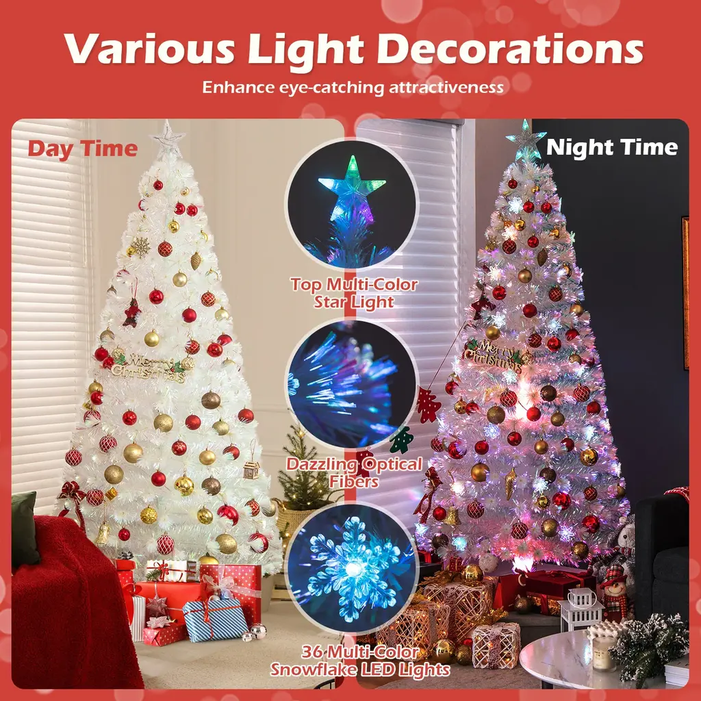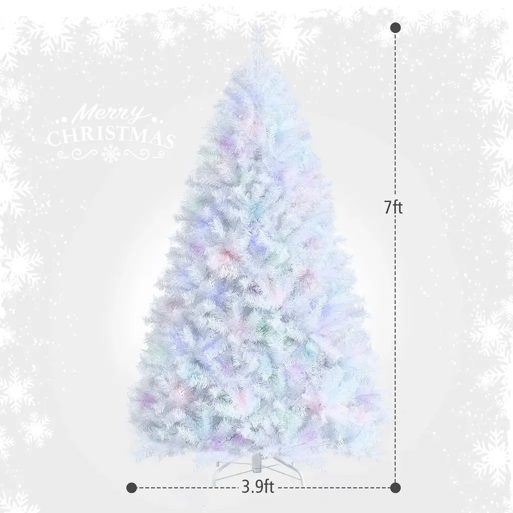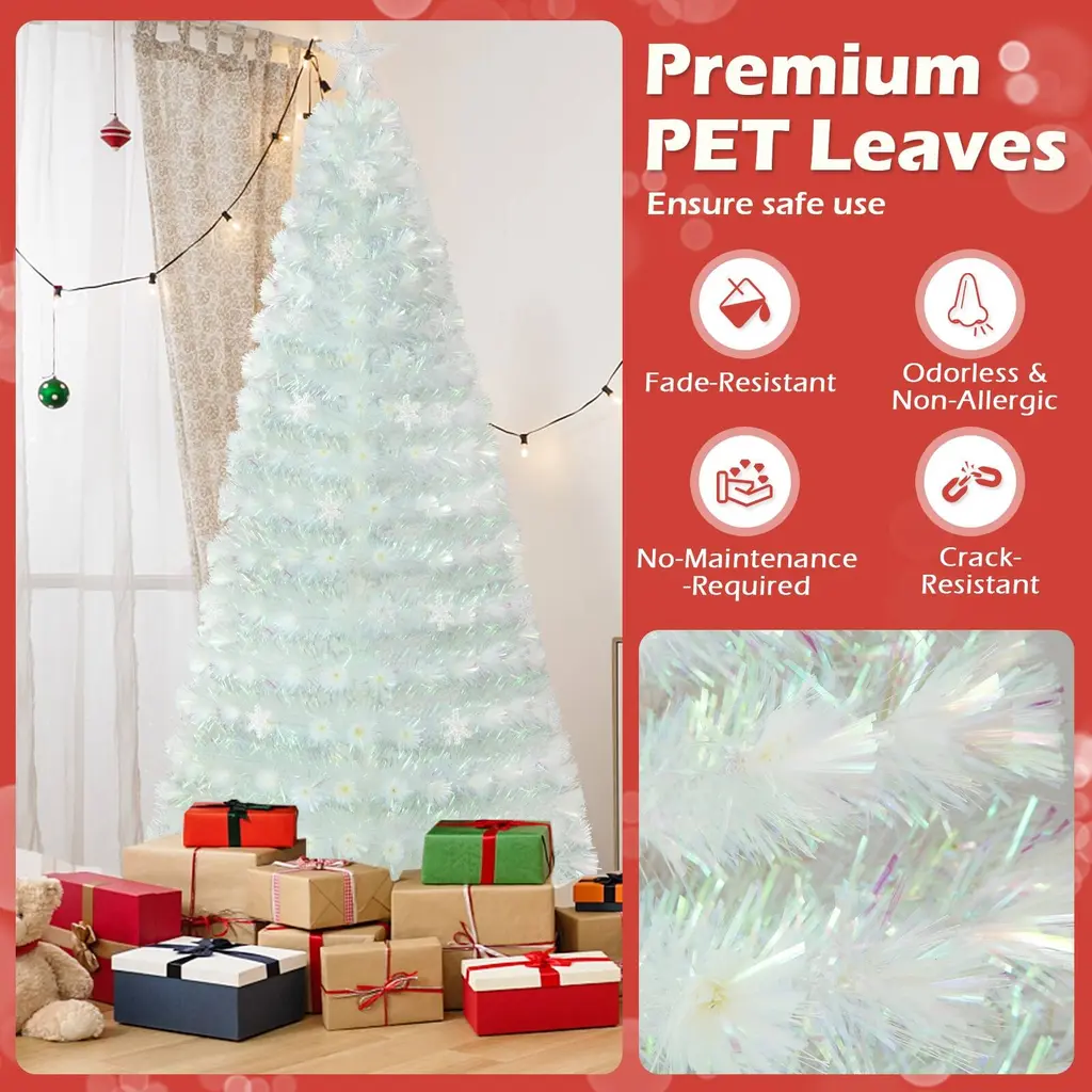 This striking 7 ft artificial Christmas tree is designed to captivate and impress. It features 270 dense branch tips, providing a full-bodied and lifelike appearance. The tree is adorned with white iridescent leaves and boasts a vivid full-white appearance, adding a unique glitter and attractiveness that captures the essence of a winter wonderland.The tree is pre-lit with dazzling optical fibers and 36 multi-color snowflake LED lights, creating a mesmerizing light show that will grab everyone's attention. A top multi-color starlight further enhances its eye-catching appeal. For added convenience, an extra snowflake decoration is provided for replacement.Crafted from high-quality PET leaves, this holiday tree is resistant to breaking and discoloration, ensuring lasting beauty. It is also odorless and non-allergic, making it safe for use in various environments.A sturdy and stable crossed metal base, attached to the trunk with three reinforced screws, ensures excellent sturdiness and stability. Non-slip footpads on the base prevent floor scratches, providing added protection.This lighted Christmas tree is perfect for various occasions, serving as a stunning centerpiece in homes, offices, schools, or stores. It also makes a fantastic holiday gift, spreading cheer and festive spirit.Key Highlights:This 7 ft artificial Christmas tree, with its all-white design and enchanting lighting, is perfect for those looking to add a touch of winter magic and elegance to their holiday celebrations. Its ease of assembly and safety features, combined with its stunning visual appeal, make it a practical and attractive choice for any festive environment.