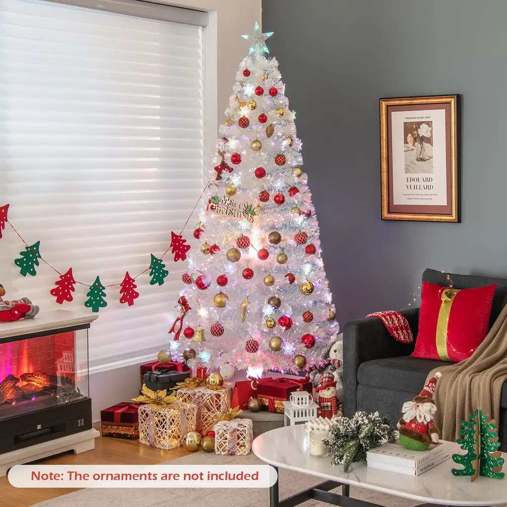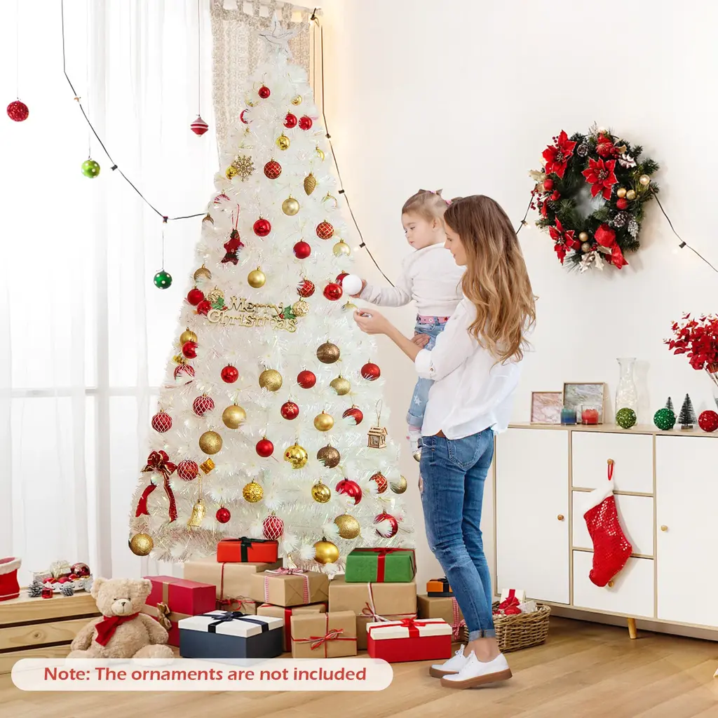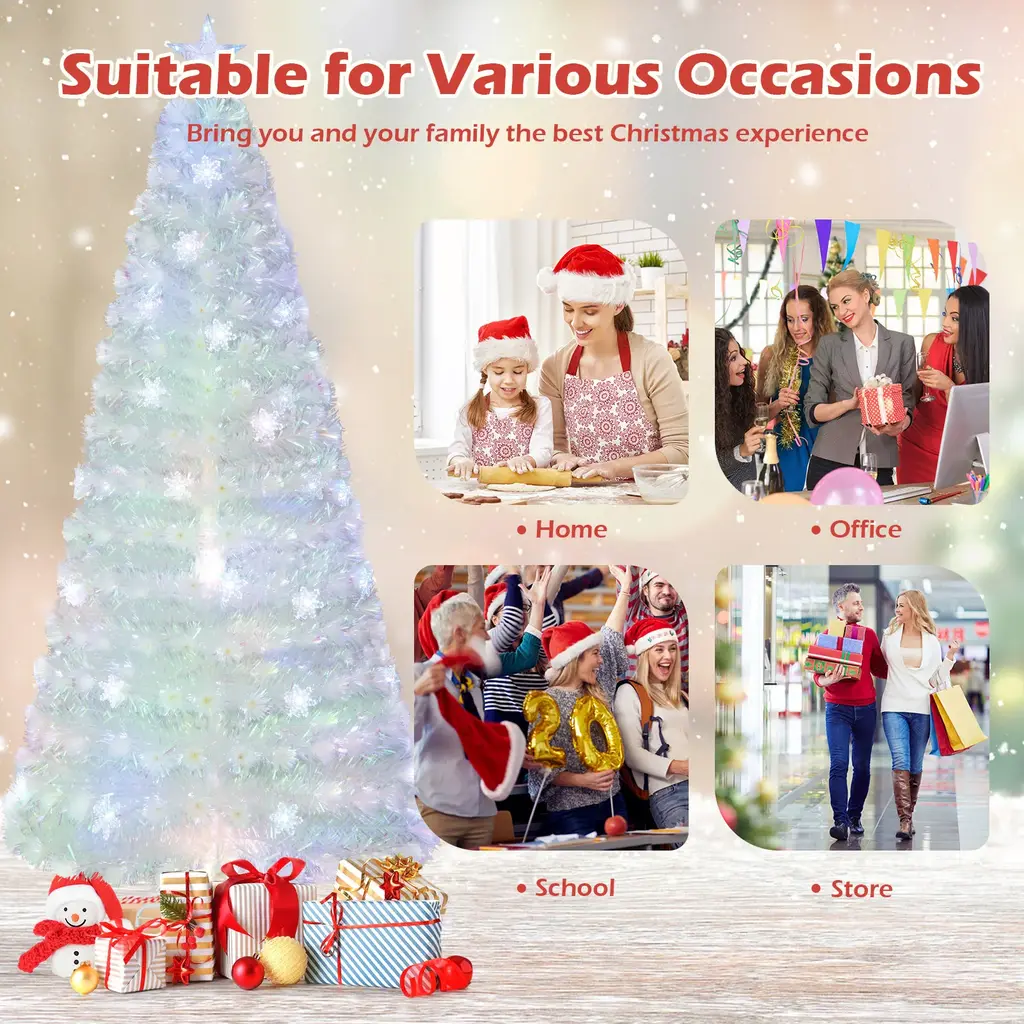This striking 7 ft artificial Christmas tree is designed to captivate and impress. It features 270 dense branch tips, providing a full-bodied and lifelike appearance. The tree is adorned with white iridescent leaves and boasts a vivid full-white appearance, adding a unique glitter and attractiveness that captures the essence of a winter wonderland.The tree is pre-lit with dazzling optical fibers and 36 multi-color snowflake LED lights, creating a mesmerizing light show that will grab everyone's attention. A top multi-color starlight further enhances its eye-catching appeal. For added convenience, an extra snowflake decoration is provided for replacement.Crafted from high-quality PET leaves, this holiday tree is resistant to breaking and discoloration, ensuring lasting beauty. It is also odorless and non-allergic, making it safe for use in various environments.A sturdy and stable crossed metal base, attached to the trunk with three reinforced screws, ensures excellent sturdiness and stability. Non-slip footpads on the base prevent floor scratches, providing added protection.This lighted Christmas tree is perfect for various occasions, serving as a stunning centerpiece in homes, offices, schools, or stores. It also makes a fantastic holiday gift, spreading cheer and festive spirit.Key Highlights:This 7 ft artificial Christmas tree, with its all-white design and enchanting lighting, is perfect for those looking to add a touch of winter magic and elegance to their holiday celebrations. Its ease of assembly and safety features, combined with its stunning visual appeal, make it a practical and attractive choice for any festive environment.