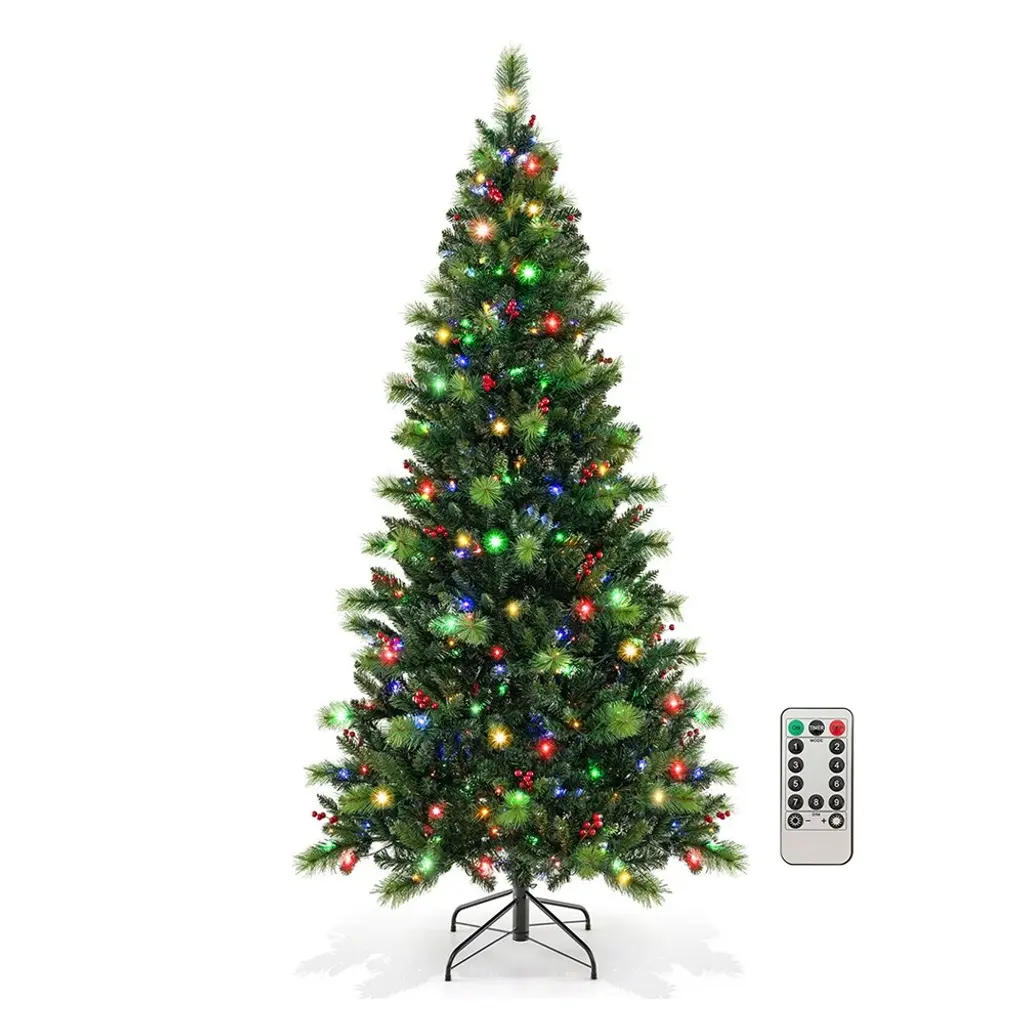▌ PRODUCT DETAILS: Description: Wish You a Happy and Warm Festival Time with Our Luxurious Christmas Tree! Experience the enchantment of the holiday season with our stunning pre-lit Christmas tree. Designed with 2 types of leaves (pine needles and PVC leaves) with different shapes, and adorned with charming red berries, this tree exudes a natural beauty. More than that, it comes with 400 color-changeable LED lights and offers 9 wonderful lighting modes, therefore you can choose different modes to fit different moods or occasions. Besides, there exist 4 levels of lighting brightness and timer function for you to choose from. Other than that, crafted from fire-resistant PVC and supported by a stable crossed metal base, our tree ensures both safety and durability. Thanks to the hinged structures and 3-section design, it is easy to set up and take down. Perfect for any setting, our luxurious and vivid Christmas tree is the ideal centerpiece for creating magical moments throughout the holiday season. Features: Features 974 dense branch tips, look realistic and vivid from far to near Decorated with 2 types of leaves and vivid red berries, bring a touch of nature The LED lights emit warm-white and colorful lighting, creating a magical festival atmosphere Adopts premium LED lights with UL588 certification and a safe UL-certified adapter 9 lighting modes allow you to create the perfect ambiance for any occasion The brightness can be adjusted in 4 levels, featuring a timer function to choose from Designed with a controller and remote control for easily controlling the setting The hinged structure makes it easy to set up and take down, saving time and effort Includes 2 pairs of gloves for protecting your hands when fluffing branches The metal base is fixed by a pre-assembled screw, requiring no hole alignment The metal base can be folded into a flat size for easy storage Specifications: Color: Green Material: PVC, Metal Tree Height: 7 ft Tree Width: 3.6 ft Diameter of the Metal Stand: 20" Number of Branch Tips: 974 Number of LED Lights: 400 Clusters of Red Berries: 36 Number of Sections: 3 Net Weight: 23 lbs Package Includes: 1 x Pre-Lit Christmas Tree 2 x Pairs of Gloves 1 x User's Manual