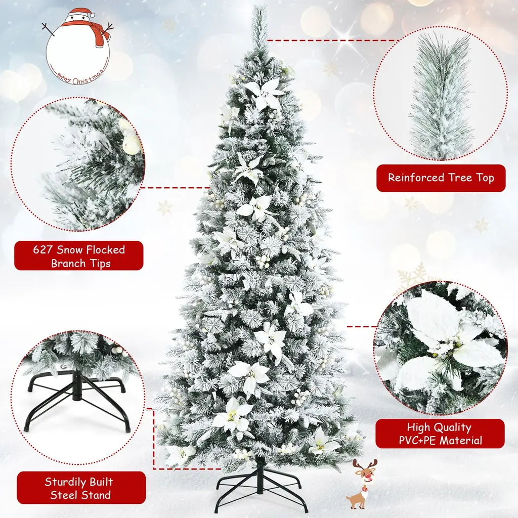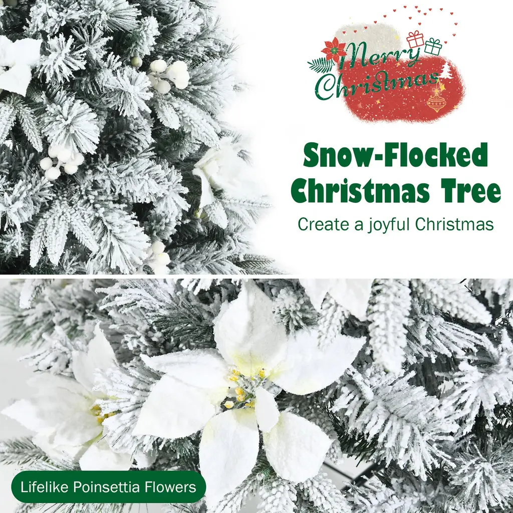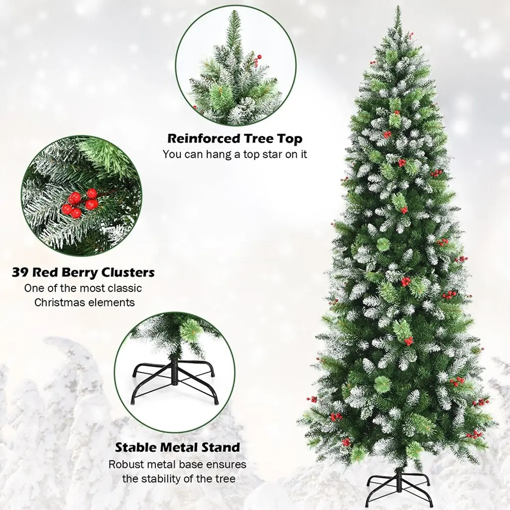 7Ft Unlit Hinged Artificial Tree W/ Snow Flocked Tips And Red Berries - 45"x72" - Green - 7 Foot