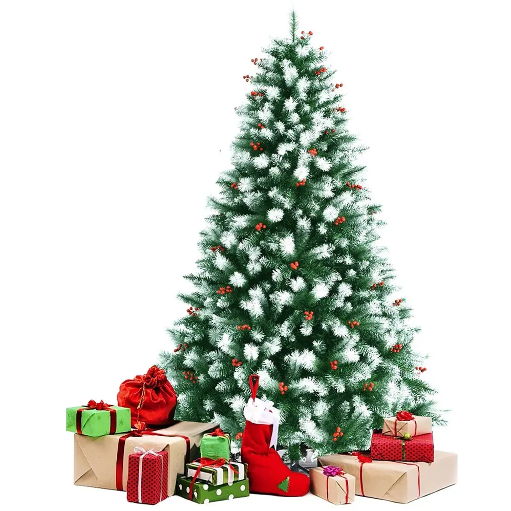 ▌ PRODUCT DETAILS: Description: Standing at 7ft tall, this artificial Christmas tree is an eye-catching centerpiece in any room during the holiday. The dense branches consist of PVC leaves and pine needles, capturing the natural charm of a real pine tree. And the snow-dusted tips and embellished red berries will add a dash of dazzling winter wonderland to your room. Different from a real tree, this artificial tree can be fluffed and stored easily with hinged sections and foldable metal stand. What's more, the tree is made of 100% new PVC material that is safe and durable for indoor long-time use. The lush Xmas tree perfectly matches with all occasions, highlighting festival vibe and holiday peaceful time. Features: 1198 pine needles and PVC tips create lush appearance Snowy green leaves & red berries form vivid natural scene Thickened branches allow to DIY tree at will Hinged sections ensure easy assembly and fluffing Foldable metal stand supports tree stably & uprightly 100% New PVC material for long-term indoor use An ideal centerpiece decorates home, leisure plaza & hotel lobby Specifications: Color: Green Material: New PVC, Iron Height: 7 FT Width: 3.8 FT Number of Branches Tip: 1198 Number of Red Berries: 78 Net weight: 21 LBS Package Includes: 1 x Christmas Tree 1 x Metal Stand