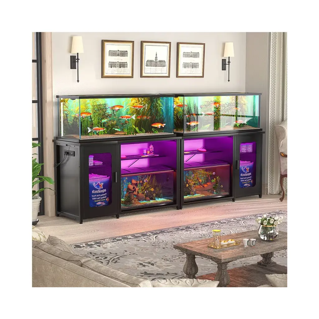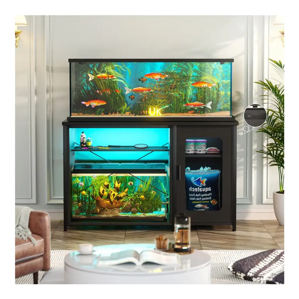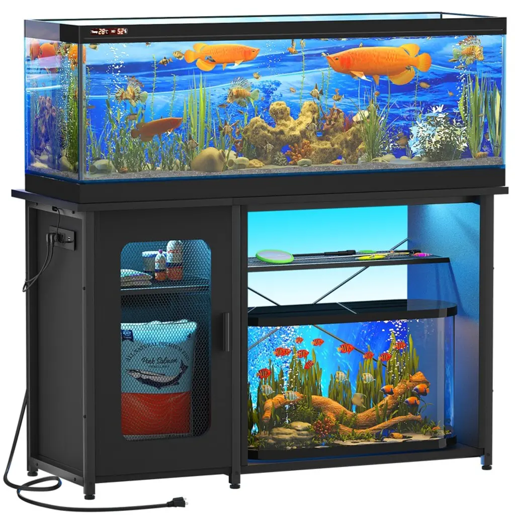 Elevate your aquatic world with this all-in-one aquarium stand, designed for style and effortless functionality. Its integrated power strip with 3 outlets and 2 USB ports keeps wires hidden and your equipment running smoothly. Command over 60,000 mesmerizing colors with app or remote-controlled RGB LEDs, featuring a music sync mode that makes your tank dance to the beat. This versatile 2-in-1 design maximizes space, offering a spacious top for a large tank and a lower shelf for a smaller terrarium. Customize your storage with the reversible cabinet and open mesh sections, perfect for all your supplies. Built with a robust powder-coated steel frame and strong MDF, it offers unwavering stability, supporting up to 880 lbs. Combining a sleek mesh design with easy assembly, it creates a stunning, wobble-free centerpiece for your home.