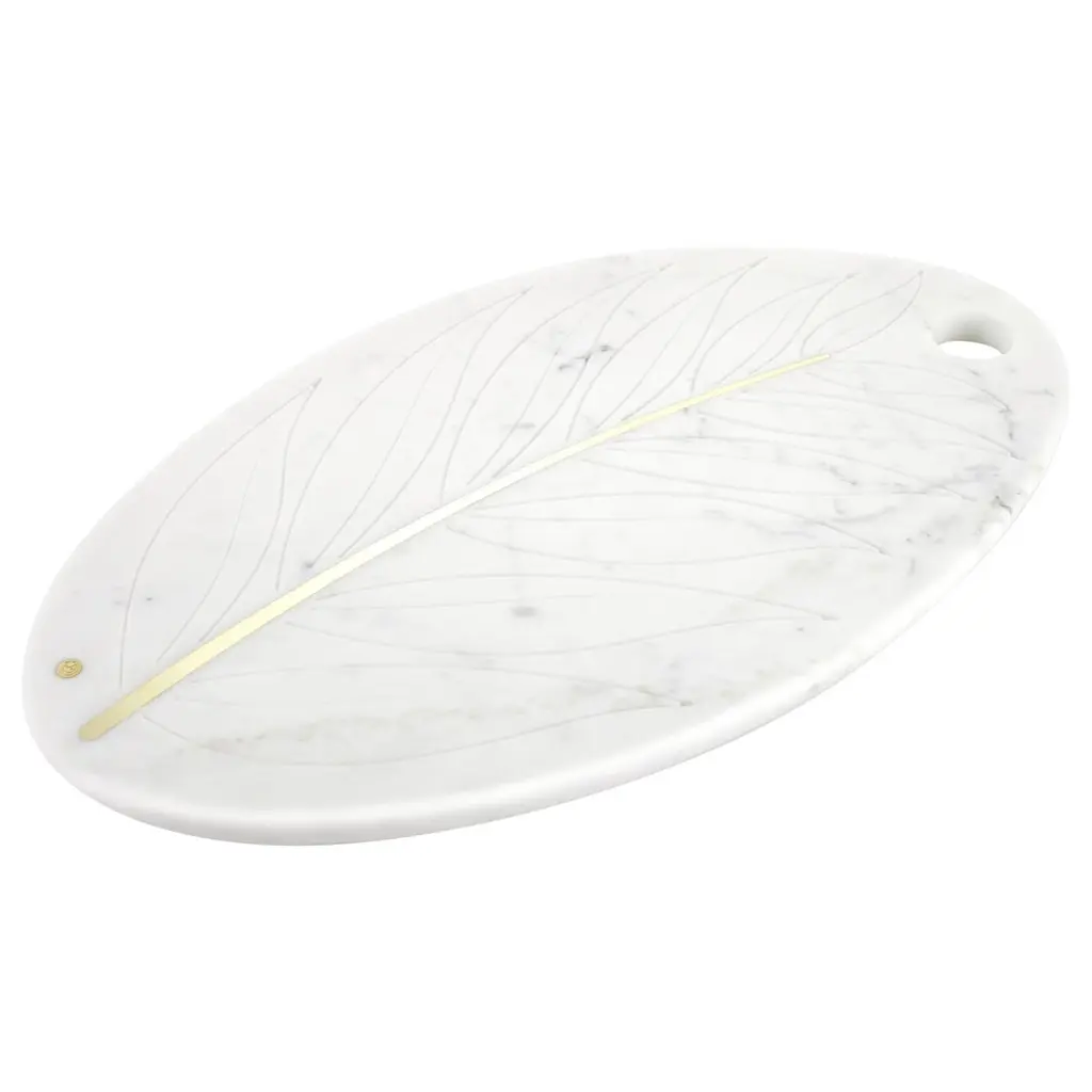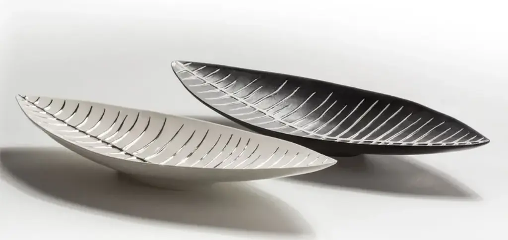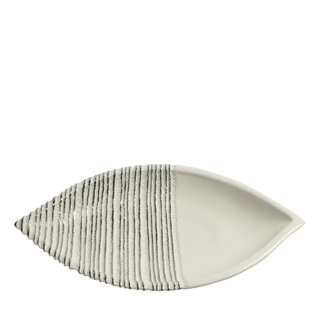 A tribal shield, a boat that sails through unknown seas, a fishbone, a leaf: the shape of this refined porcelain centerpiece leaves room for imagination. Available in black with white decoration and in white with platinum, on request it can also be made in white with 23K gold decoration.NAUM - Illusory perspectives, graphic tensions, patchworks of colours and rounded quadrilaterals define the florid forms of porcelain centrepieces, vases and bottles characterized by an eccentric balance. Light spirals, now brimful now fluid, rise slowly along asymmetric and jutted out profiles, and here they stop and then start an hypnotic oscillation in the background of plastic and maternal shapes.