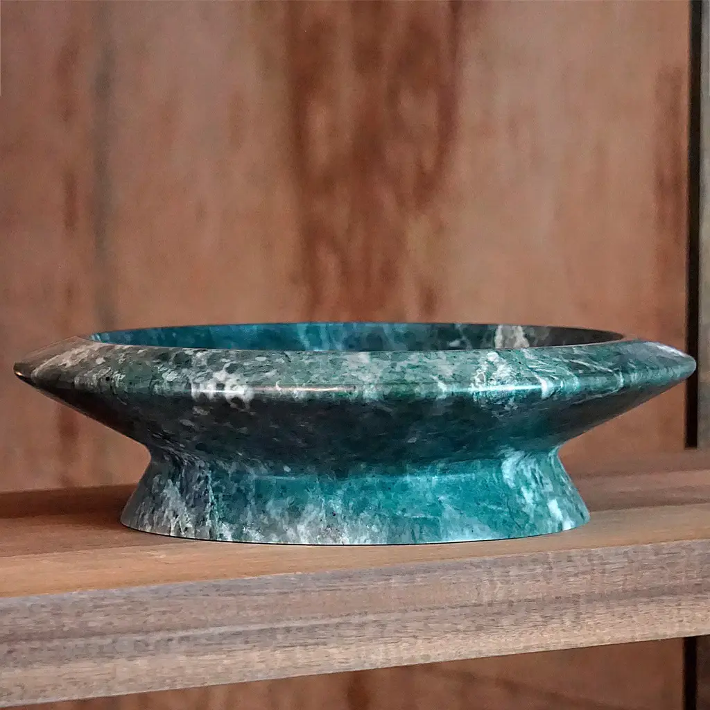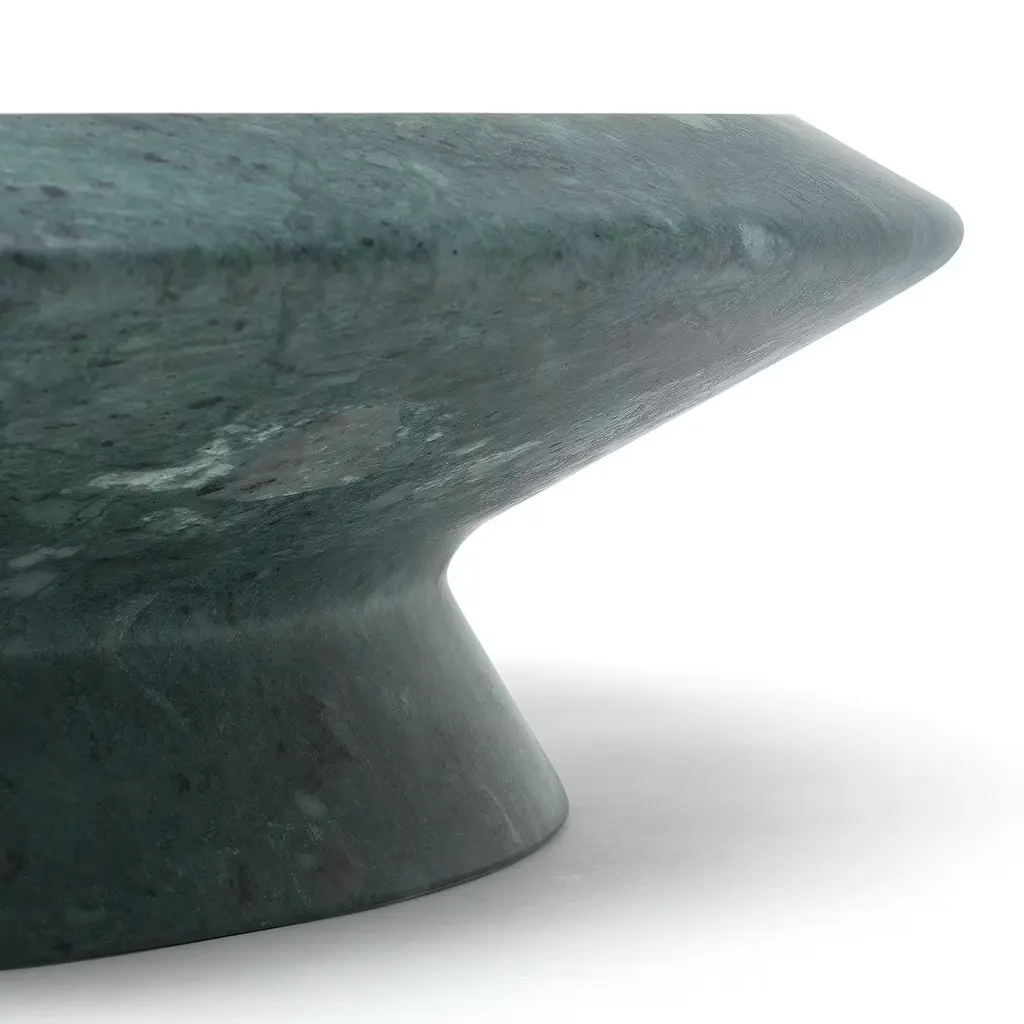 This superb round centerpiece will be a glamorous statement piece in any modern or contemporary setting, where it will enchant with the emerald tone of its rounded silhouette in green Guatemala marble. Incorporating a flared, footed base, it flaunts one-off veins that make each piece from the Amaltea series truly unique yet sharing with the sober and soft lines inspired by the works by architect Angelo Mangiarotti. Please note that marbles and stones are natural materials and they can differ also if coming from the same quarry or the same block. The product shown may differ from purchased items. Every piece is unique.