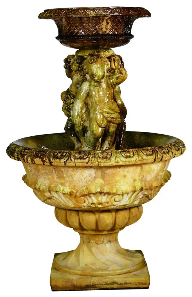 • Please Note: Our color chart is for example purposes only. Monitor settings and how the finish is applied to these outdoor water fountains can vary to what is shown in the color chart. Actual stone samples of each finish can be purchased to help you make your finish choice.The Antique Cherubs Fountain is a centerpiece of serenity and beauty of nature for your garden or outdoor space. This fountain brings tranquility through its flowing sounds and a feeling of being one with nature. The main attraction of the fountain is four cherubs standing in a basin holding the bowl above their heads, reflecting the religious influence of the Renaissance. The fountain is made from premium cast stone. Each fountain is individually handcrafted by the best artisans in the industry to last for generations of outdoor use. Skilled artisans using Old World techniques finish the fountain in your choice of an unparalleled selection of beautiful colors.Made in USA Made of cast stone to last a lifetimeIncludes one fountain pump Dimensions: 47" W x 70" H x 47" DWeight: 1523 lbs.Available in multiple finishesFountain Pictured in Relic Sargasso• The finish/stain is hand applied and can vary from what is shown on the fountain or color sample.• • Each fountain is made to order and requires about 3-4 weeks for production and delivery