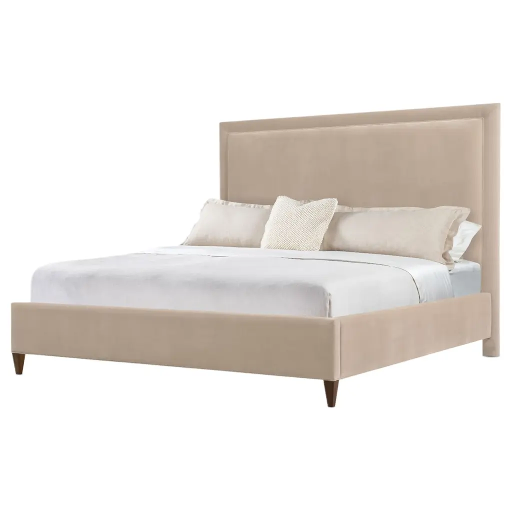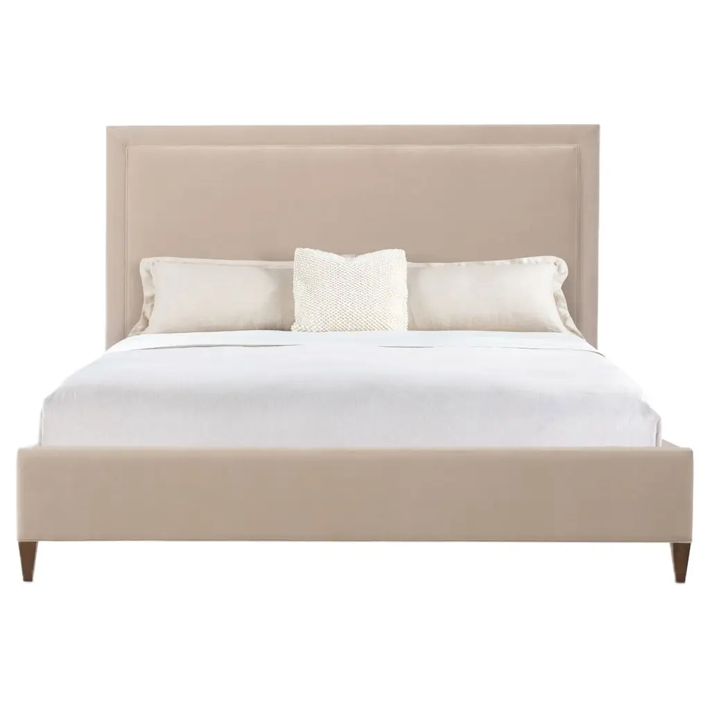 The Archives Upholstered Bed offers a luxurious sleep experience with its plush velvet upholstery and elegant design. Crafted with rich figured walnut veneers, the bed includes a headboard, footboard, and rails. Elegant welt trim and wood tapered legs complete the design, making it a perfect addition to any modern or traditional bedroom. This bed combines luxurious materials and classic design for a striking bedroom centerpiece, providing both comfort and style.