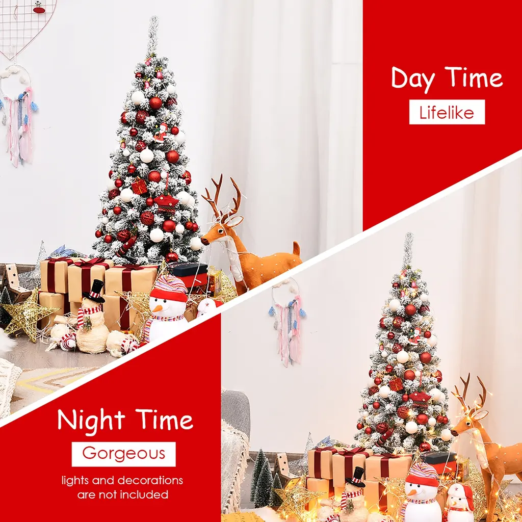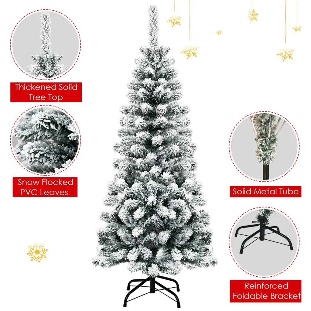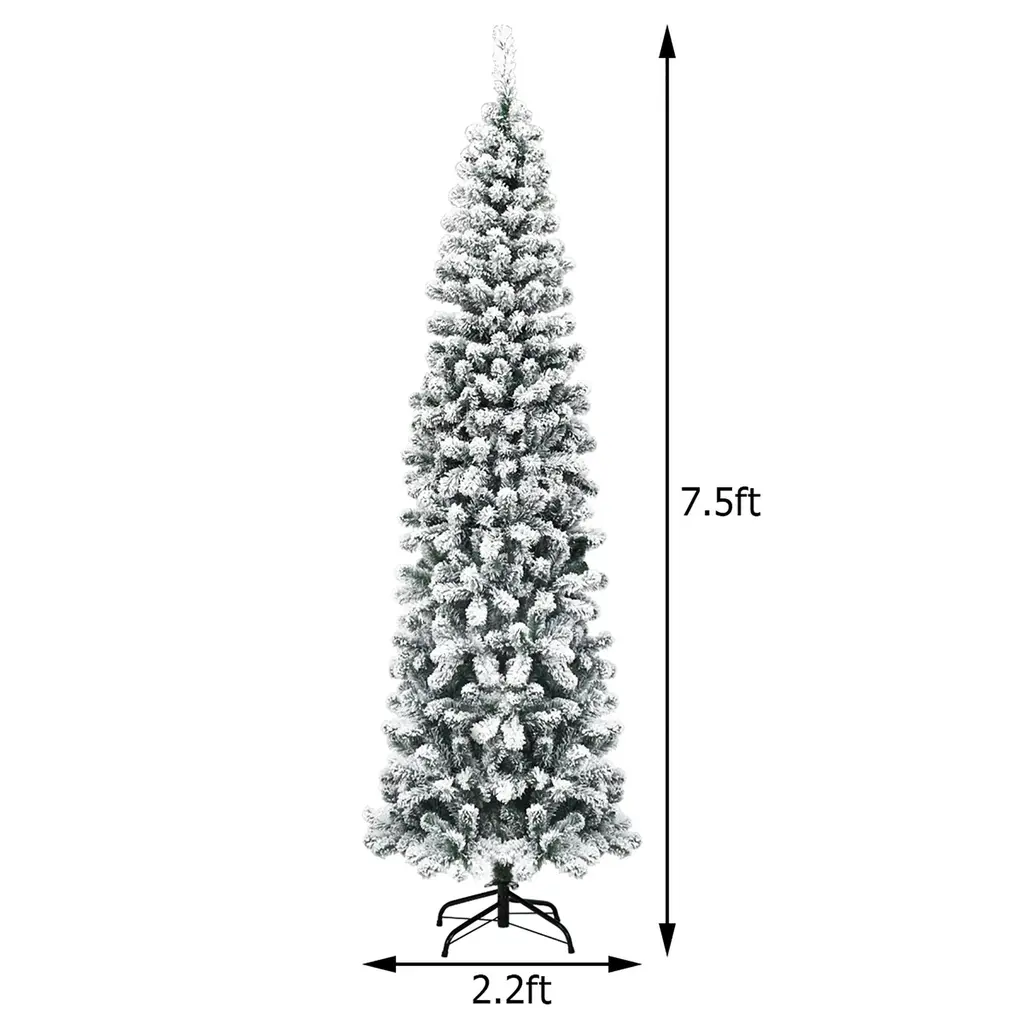 Bring the winter wonderland indoors with our Artificial Snow Flocked Christmas Tree. Crafted from high-quality PVC materials, our tree provides a sturdy and safe centerpiece for your holiday decor. With hundreds of branch tips, this tree offers ample space to hang ornaments and decorations. The slim pencil design makes it ideal for placement in narrow spaces while the snow-flocked appearance adds a touch of fun to your festivities.Features:Specifications: