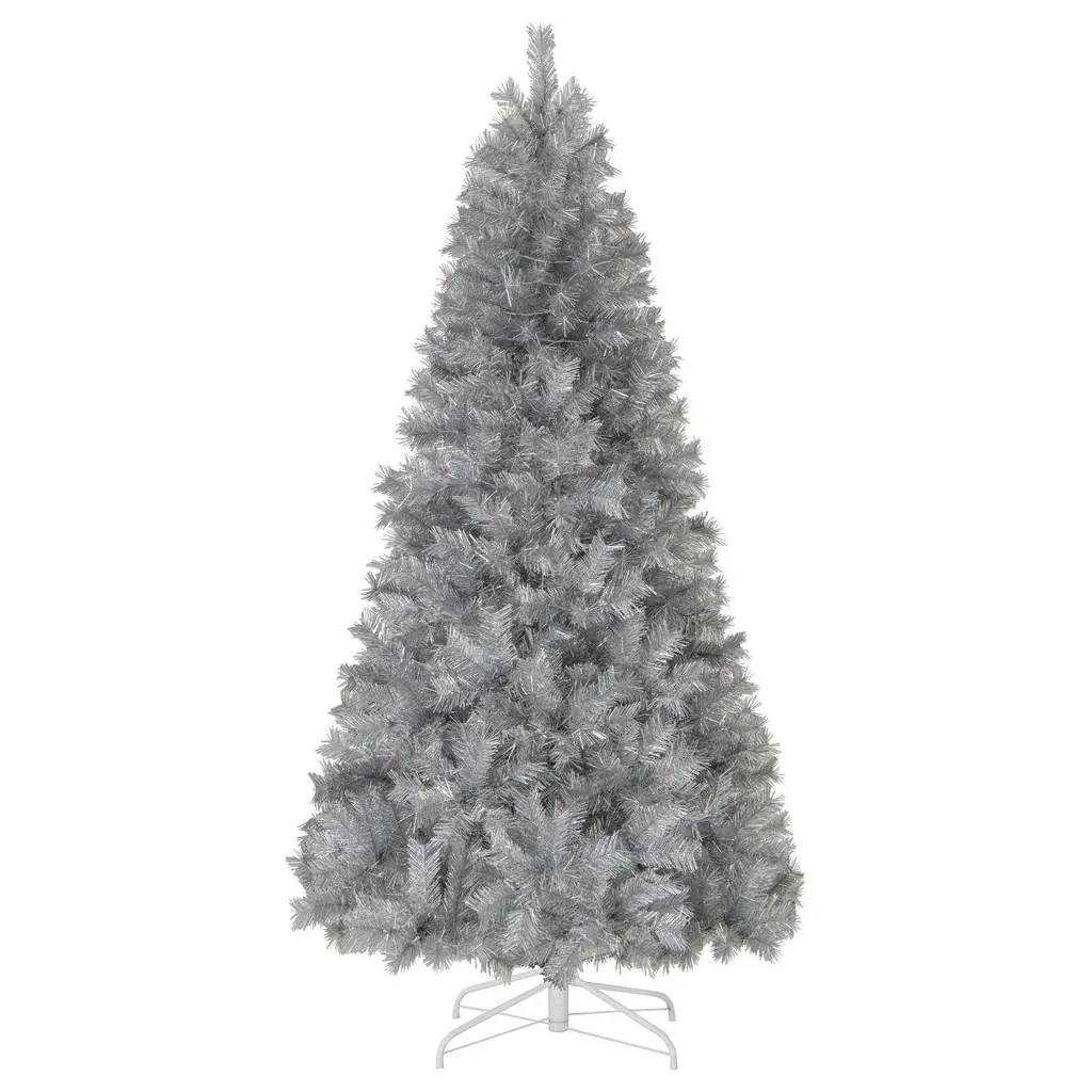 Specification:Key Features:Description: This artificial Christmas tree, available in 5 ft, 6 ft, and 7 ft sizes, is the perfect addition to your holiday décor, offering a stunning display with 170, 230, or 400 warm white LED lights for a cozy, radiant glow. Designed with silver tinsel leaves, it features 385, 553, or 807 branch tips that catch the light beautifully, creating a festive atmosphere for your celebrations. Made from durable PVC and supported by a robust metal stand, this tree ensures safety and stability, with a user-friendly hinged structure that simplifies assembly. The metal stand, equipped with an anti-slip design, provides extra support to keep the tree secure throughout the season. Ideal for families with children and pets, it is fireproof and free from any unpleasant odors, making it a reliable and visually striking centerpiece for your holiday gatherings.