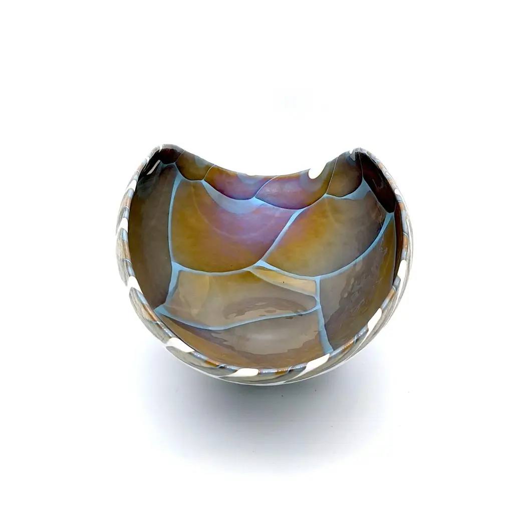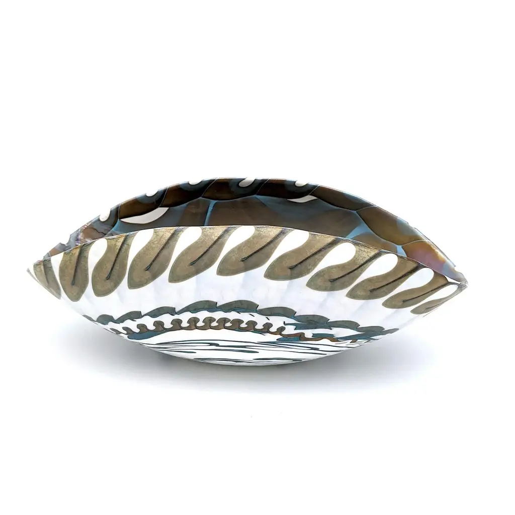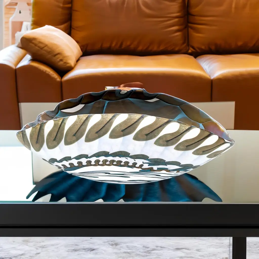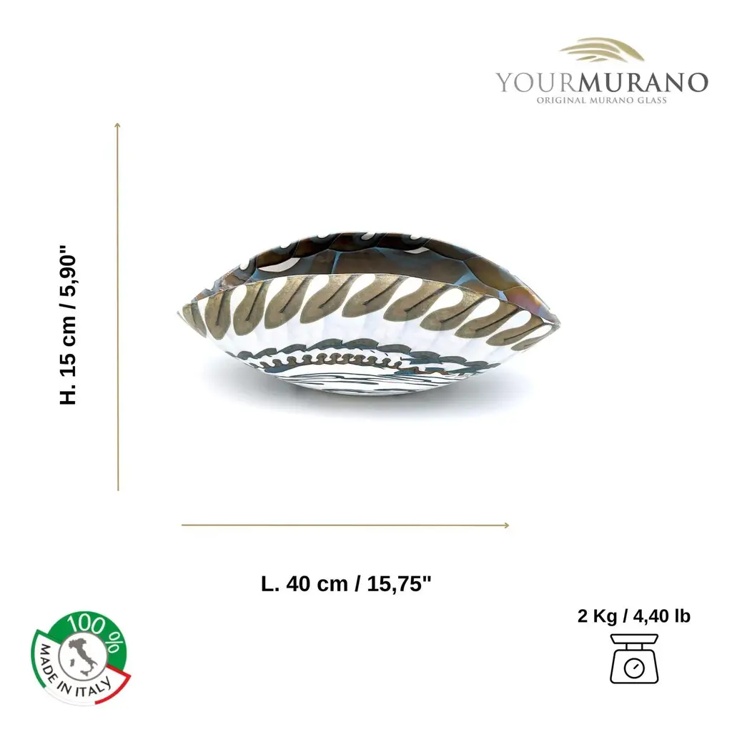 Handcrafted centerpiece in colored glass with iridescent reflections. The elegant design and neutral tones make it an ideal furnishing accessory for any home environment, adding a touch of sophistication and style. Also perfect as an exclusive gift, it enhances the beauty and functionality of Murano craftsmanship. Labeled by Maker