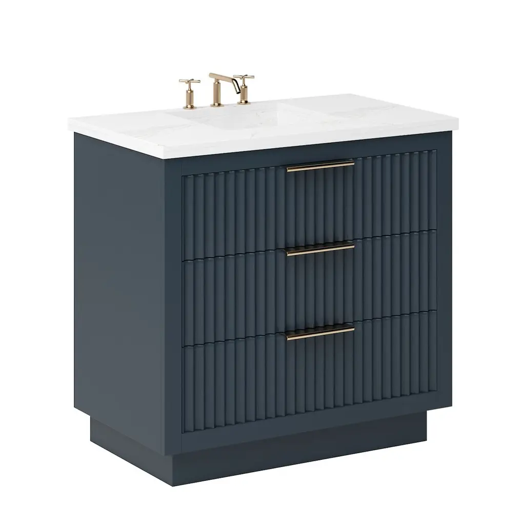 The Ashford Three-Drawer Single Bathroom Vanity is a masterpiece of contemporary design, exuding elegance with its sleek scalloped details that breathe new life into any bathroom space. This vanity is not just a piece of furniture; it's a statement of style and functionality, crafted to stand the test of time. Its freestanding design showcases a bold two-inch frame that proudly accentuates the soft-close doors and drawers, all enveloped in a luxurious satin varnish. Whether you desire a single or double configuration, the Ashford collection offers a variety of sizes to perfectly fit your space. With its versatile design, this vanity promises to be the centerpiece of your bathroom, offering both beauty and practicality in equal measure.