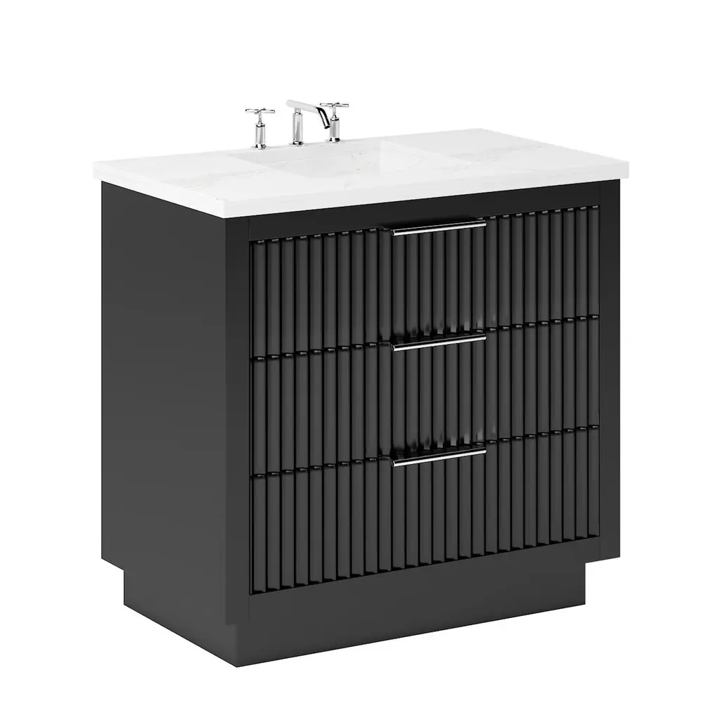 The Ashford Three-Drawer Single Bathroom Vanity is a masterpiece of contemporary design, exuding elegance with its sleek scalloped details that breathe new life into any bathroom space. This vanity is not just a piece of furniture; it's a statement of style and functionality, crafted to stand the test of time. Its freestanding design showcases a bold two-inch frame that proudly accentuates the soft-close doors and drawers, all enveloped in a luxurious satin varnish. Whether you desire a single or double configuration, the Ashford collection offers a variety of sizes to perfectly fit your space. With its versatile design, this vanity promises to be the centerpiece of your bathroom, offering both beauty and practicality in equal measure.