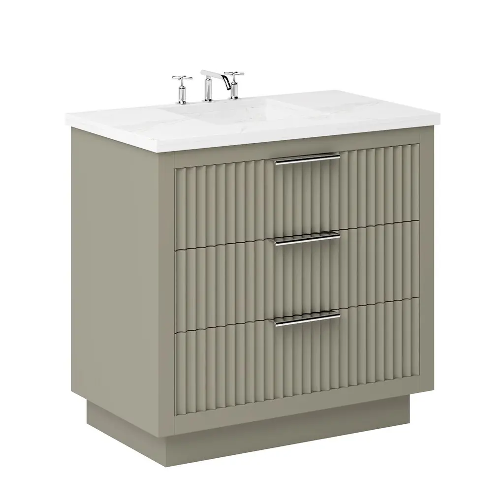 The Ashford Three-Drawer Single Bathroom Vanity is a masterpiece of contemporary design, exuding elegance with its sleek scalloped details that breathe new life into any bathroom space. This vanity is not just a piece of furniture; it's a statement of style and functionality, crafted to stand the test of time. Its freestanding design showcases a bold two-inch frame that proudly accentuates the soft-close doors and drawers, all enveloped in a luxurious satin varnish. Whether you desire a single or double configuration, the Ashford collection offers a variety of sizes to perfectly fit your space. With its versatile design, this vanity promises to be the centerpiece of your bathroom, offering both beauty and practicality in equal measure.