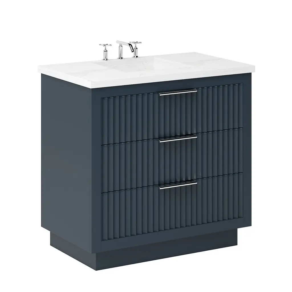 The Ashford Three-Drawer Single Bathroom Vanity is a masterpiece of contemporary design, exuding elegance with its sleek scalloped details that breathe new life into any bathroom space. This vanity is not just a piece of furniture; it's a statement of style and functionality, crafted to stand the test of time. Its freestanding design showcases a bold two-inch frame that proudly accentuates the soft-close doors and drawers, all enveloped in a luxurious satin varnish. Whether you desire a single or double configuration, the Ashford collection offers a variety of sizes to perfectly fit your space. With its versatile design, this vanity promises to be the centerpiece of your bathroom, offering both beauty and practicality in equal measure.