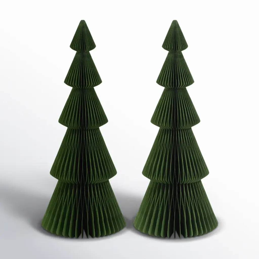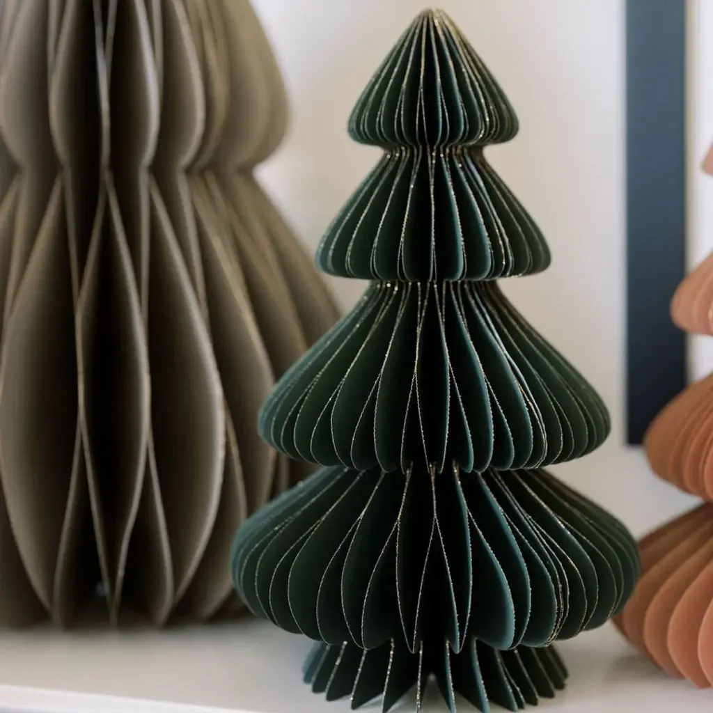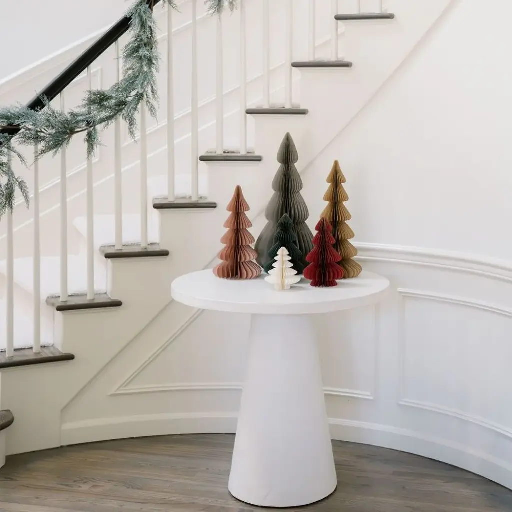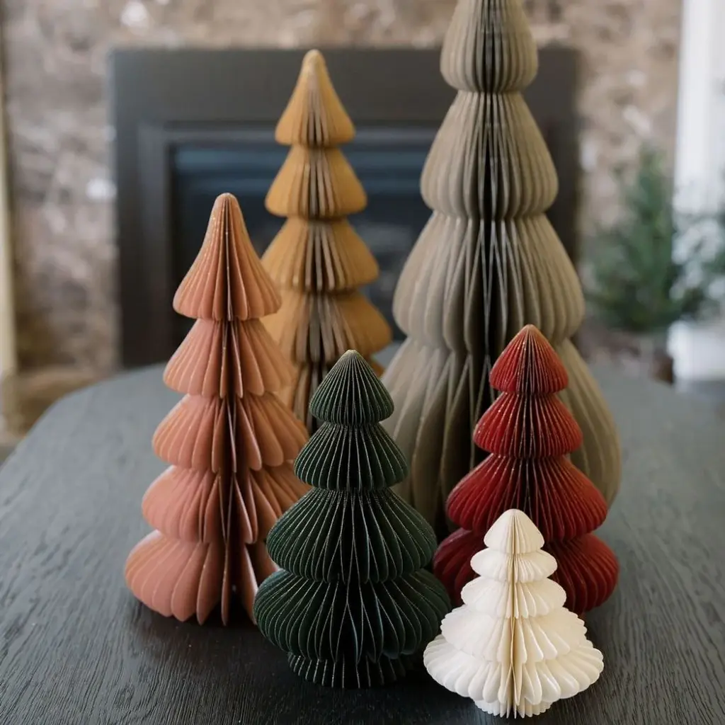 Create a festive forest in your home with the Assorted Paper Trees. Crafted from folded honeycomb paper, this set of six trees brings rich color, playful texture, and timeless holiday charm to mantels, tabletops, and shelves. Each tree easily folds open to form its sculptural shape and tucks away flat for effortless storage after the season. This collection includes a beautiful range of sizes -perfect for layering into vignettes or displaying as a statement centerpiece: 6 inches 9 inches (2 trees) 14 inches 18 inches 22 inches Featuring warm seasonal tones from deep burgundy and forest green to soft cream and muted mauve, these paper trees pair seamlessly with both modern and traditional holiday decor.