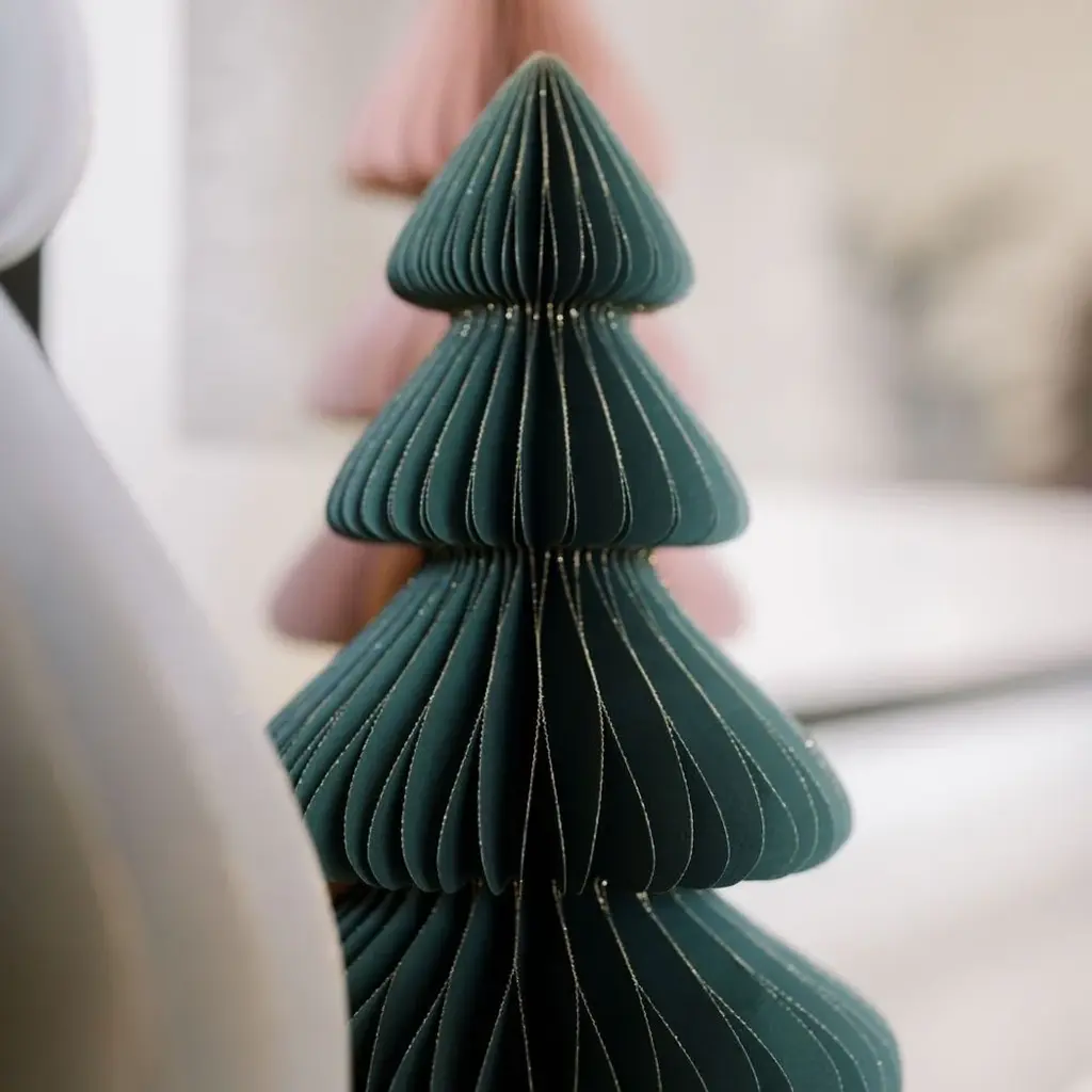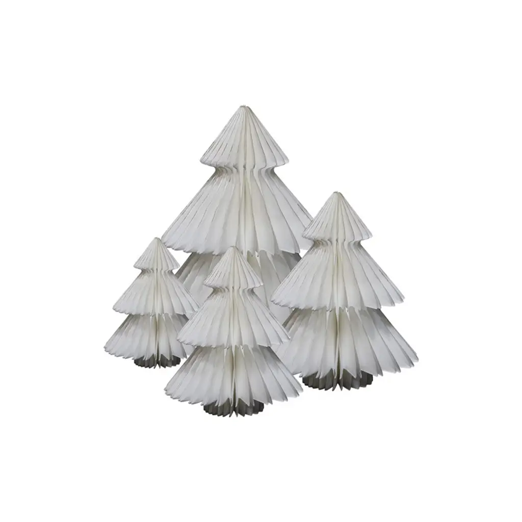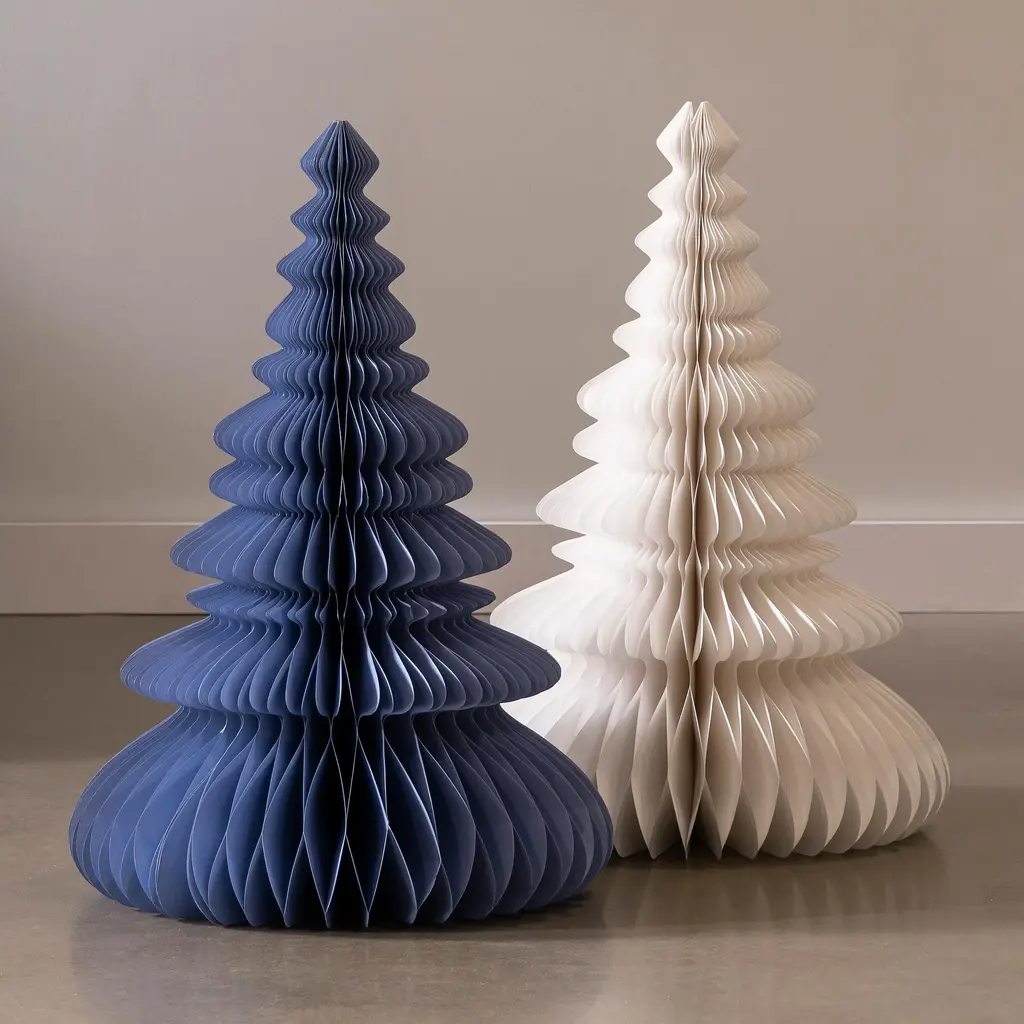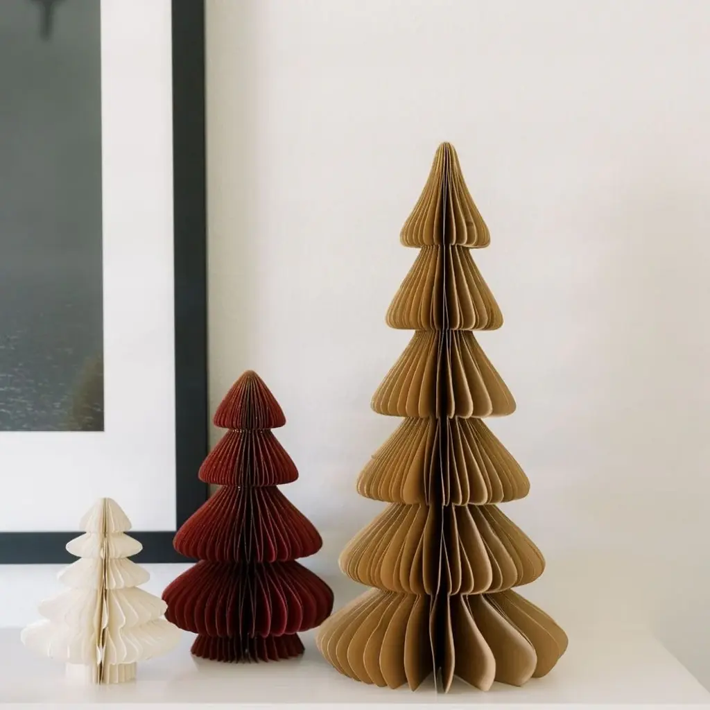 Create a festive forest in your home with the Assorted Paper Trees. Crafted from folded honeycomb paper, this set of six trees brings rich color, playful texture, and timeless holiday charm to mantels, tabletops, and shelves. Each tree easily folds open to form its sculptural shape and tucks away flat for effortless storage after the season. This collection includes a beautiful range of sizes -perfect for layering into vignettes or displaying as a statement centerpiece: 6 inches 9 inches (2 trees) 14 inches 18 inches 22 inches Featuring warm seasonal tones from deep burgundy and forest green to soft cream and muted mauve, these paper trees pair seamlessly with both modern and traditional holiday decor.