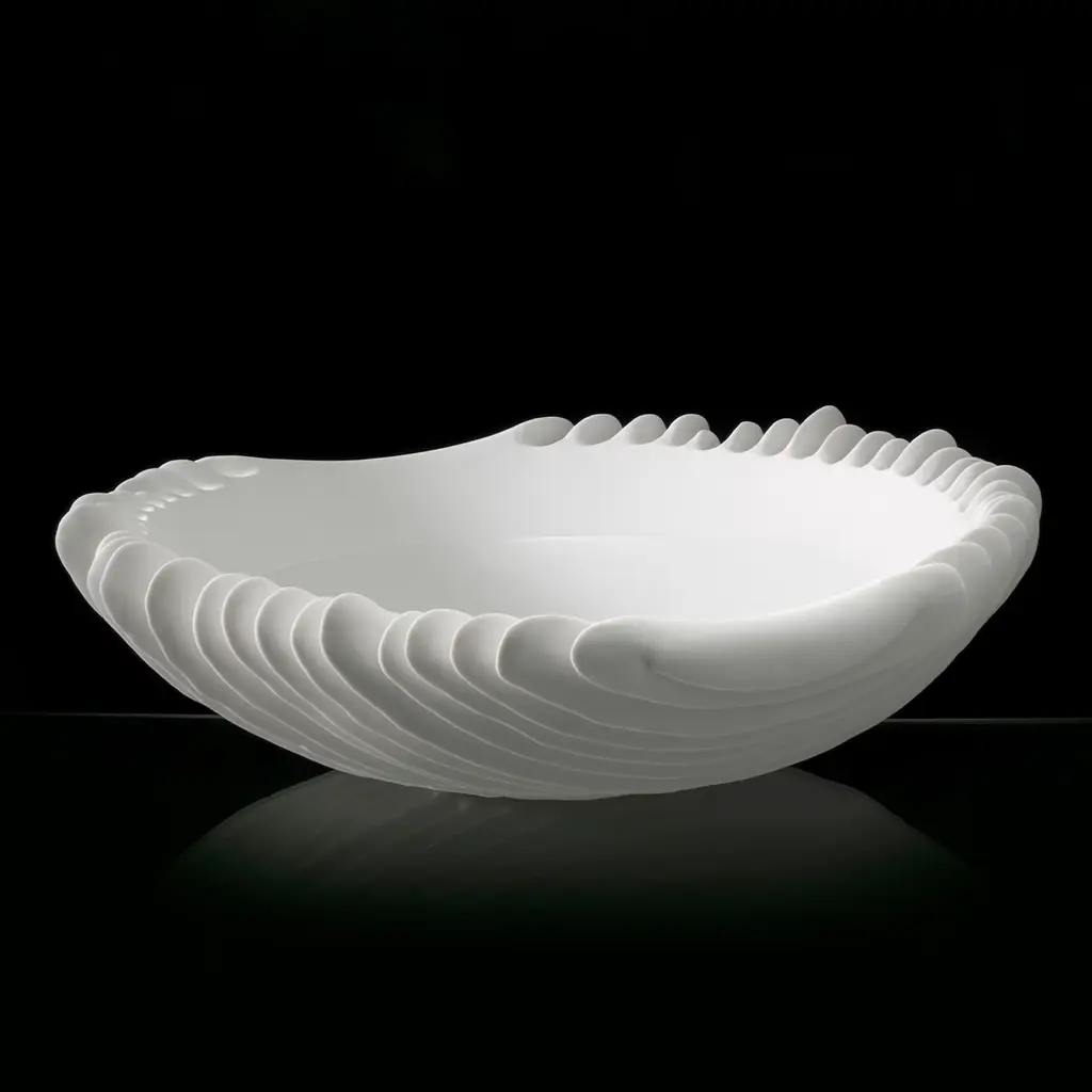 The smooth surface of a snow-white porcelain shell is riddled on the outside with fine crevices. A meticulously crafted mold and the use of unglazed porcelain, or "biscuit", make this versatile piece an exquisite objet d'art.