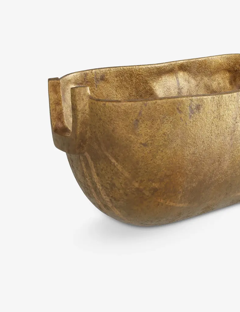 Inset handles add a metallic touch to the carved stone basin of this modern centerpiece. The piece is marked by its organic character, ready to offer fresh depth and artistry to a tabletop display.
