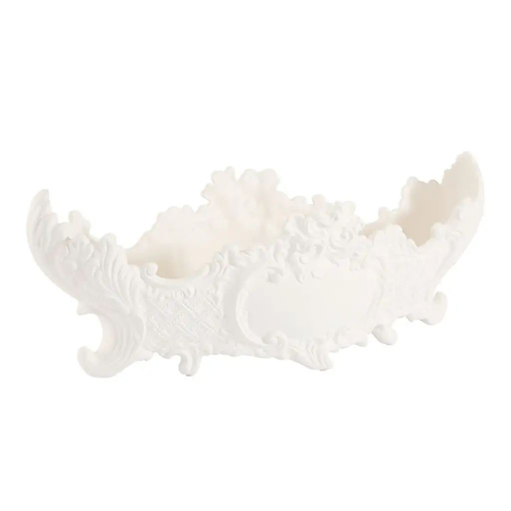 Our Baroque Centerpiece was inspired by the highly ornate decorative style so popular throughout Europe in the 17th and early 18th centuries. Beautiful filled with lemons or dried florals, this elegant vessel was handmade exclusively for us in the picturesque Northern Italian town of Bassano del Grappa, where fine ceramics have been produced since the 17th century. Using a special white clay called terraglia dolce ("sweet earthenware") found in the nearby Dolomite mountains, skilled family artisans meticulously hand shape and carve each Centerpiece to create the sumptuously scrolled acanthus and lattice relief on both sides. Baked at 1000 degrees Celsius, the ceramic shape comes out of the kiln resembling smooth porcelain, perfect for hand applying the bisque ivory finish. Each Baroque Centerpiece is stamped underneath with "Hand Made in Italy" and signed by the artist. Baroque Centerpiece features: