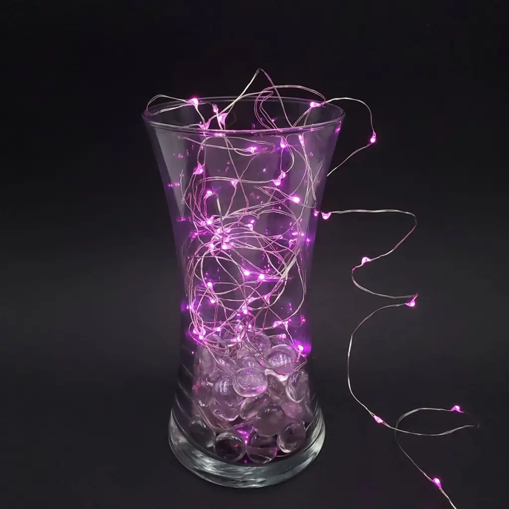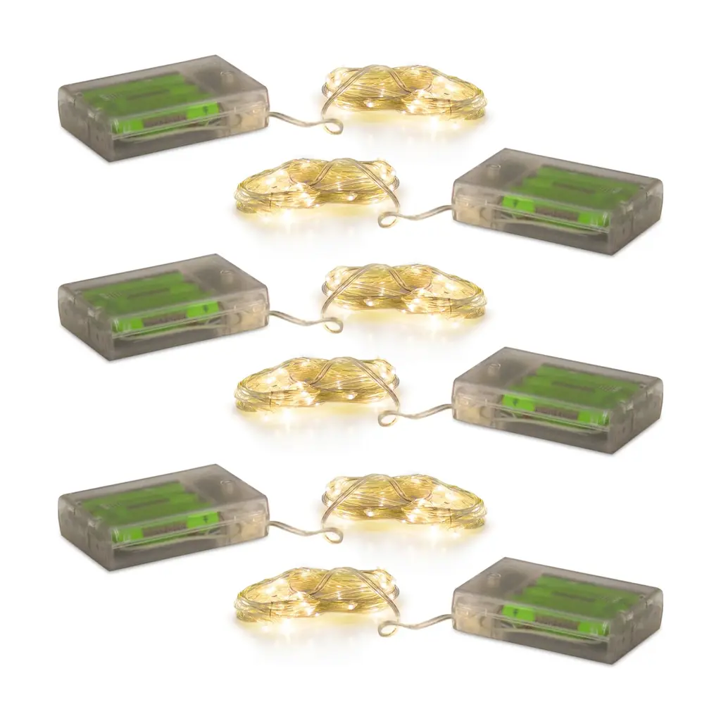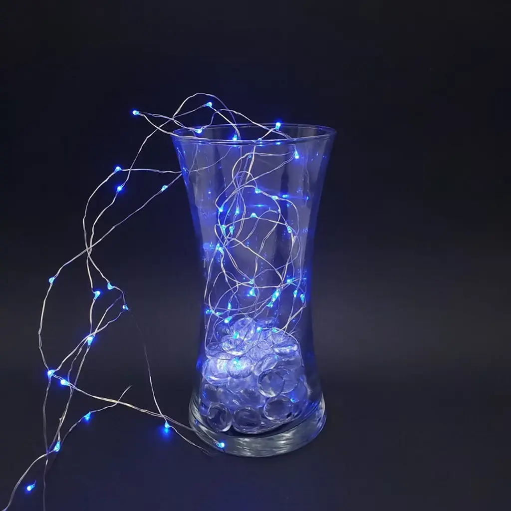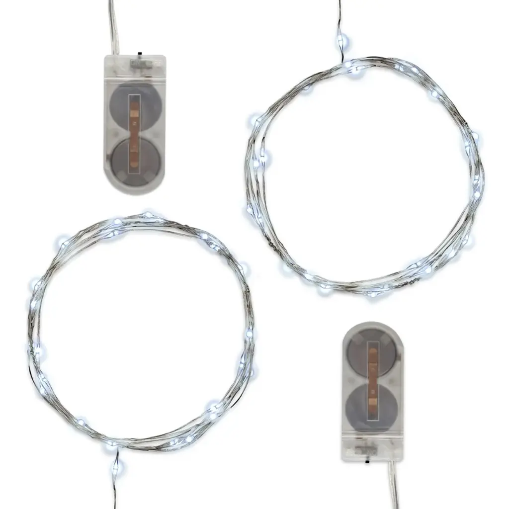 Battery-operated fairy string lights will bring a spectacular ambience to a special event, party, or celebration. Create a stunning display with this set of three bendable wire cords with glowing mini LED lights. The micro lights look like a glimmering droplet of water clinging to a shiny silver wire. These weatherproof lights are perfect for illuminating a vase, floral arrangement, centerpiece, mantel, or table setting. Each string light requires 2 CR2032 batteries (included and replaceable). Fairy string lights are also known as rice lights or micro lights.